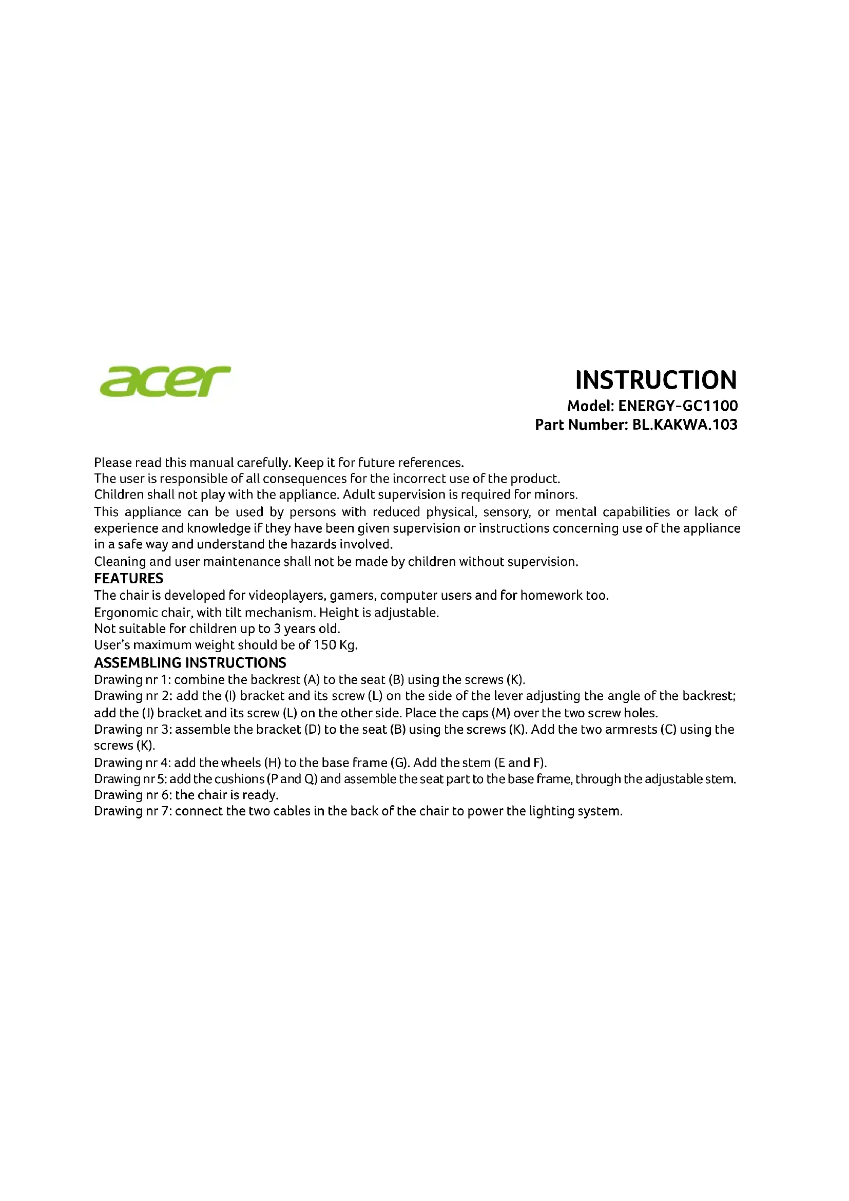 ASSEMBLY INSTRUCTION Model: ENERGY-GC1100 Part Number: BL.KAKWA.103INSTRUCTION Model: ENERGY-GC1100 Part Number: BL.KAKWA.103 Please read this manual carefully. Keep it for future references. The user is responsible of all consequences for the incorrect use of the product. Children shall not play with the appliance. Adult supervision is required for minors. This appliance can be used by persons with reduced physical, sensory, or mental capabilities or lack of experience and knowledge if they have been given supervision or instructions concerning use of the appliance in a safe way and understand the hazards involved. Cleaning and user maintenance shall not be made by children without supervision. FEATURES The chair is developed for videoplayers, gamers, computer users and for homework too. Ergonomic chair, with tilt mechanism. Height is adjustable. Not suitable for children up to 3 years old. User’s maximum weight should be of 150 Kg. ASSEMBLING INSTRUCTIONS Drawing nr 1: combine the backrest (A) to the seat (B) using the screws (K). Drawing nr 2: add the (I) bracket and its screw (L) on the side of the lever adjusting the angle of the backrest; add the (J) bracket and its screw (L) on the other side. Place the caps (M) over the two screw holes. Drawing nr 3: assemble the bracket (D) to the seat (B) using the screws (K). Add the two armrests (C) using the screws (K). Drawing nr 4: add the wheels (H) to the base frame (G). Add the stem (E and F). Drawing nr 5: add the cushions (P and Q) and assemble the seat part to the base frame, through the adjustable stem. Drawing nr 6: the chair is ready. Drawing nr 7: connect the two cables in the back of the chair to power the lighting system.Drawing nr 8: connect the USB cable to a power bank (not included) and place it in the pocket under the seat. The lights will turn on. Use the remote control to adjust them.