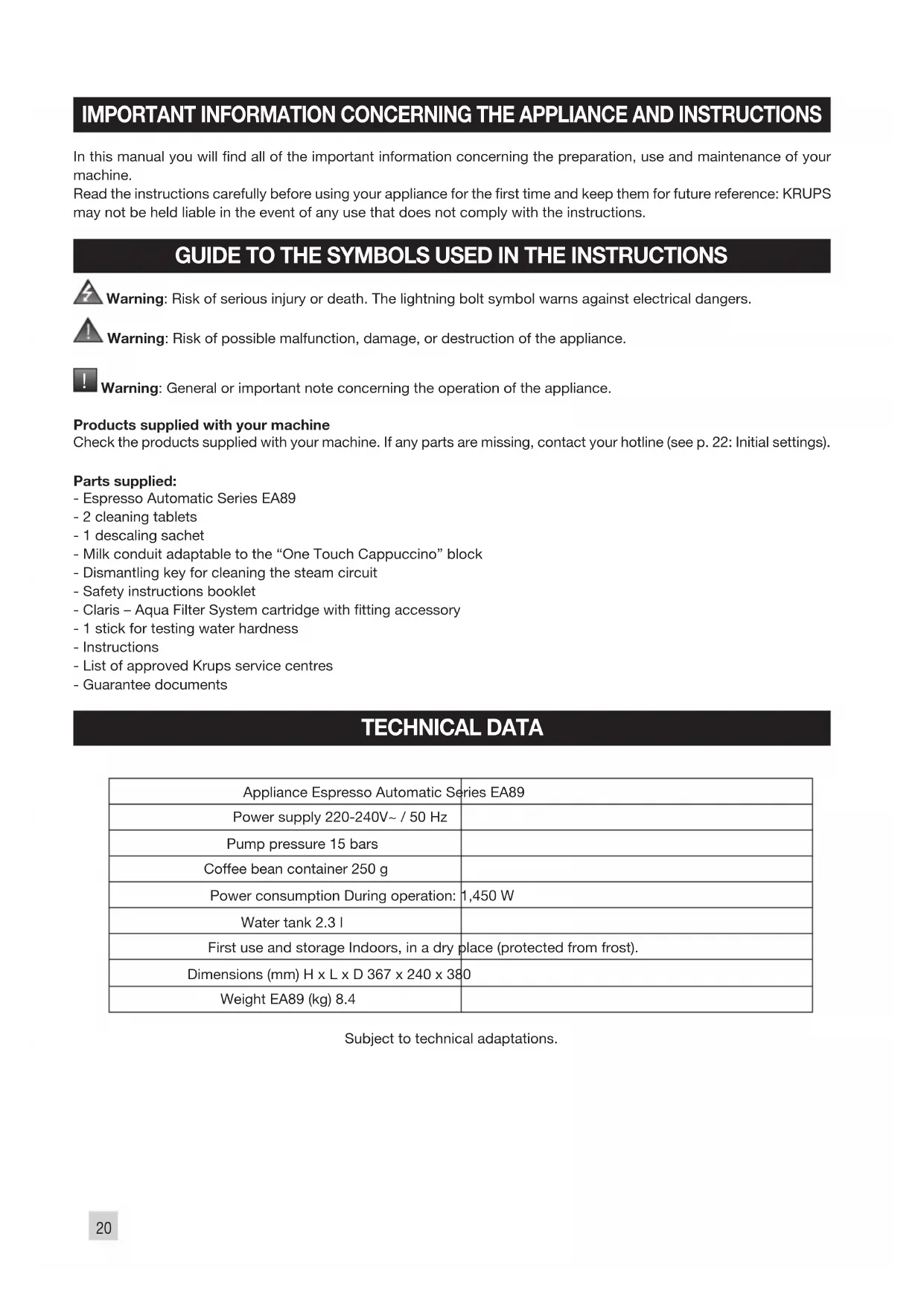 Products supplied with your machine Check the products supplied with your machine. If any parts are missing, contact your hotline (see p. 22: Initial settings). Parts supplied: - Espresso Automatic Series EA89 - 2 cleaning tablets - 1 descaling sachet - Milk conduit adaptable to the “One Touch Cappuccino” block - Dismantling key for cleaning the steam circuit - Safety instructions booklet - Claris – Aqua Filter System cartridge with tting accessory - 1 stick for testing water hardness - Instructions - List of approved Krups service centres - Guarantee documents TECHNICAL DATA Appliance Espresso Automatic Series EA89 Power supply 220-240V~ / 50 Hz Pump pressure 15 bars Coffee bean container 250 g Power consumption During operation: 1,450 W Water tank 2.3 l First use and storage Indoors, in a dry place (protected from frost). Dimensions (mm) H x L x D 367 x 240 x 380 Weight EA89 (kg) 8.4 Subject to technical adaptations.