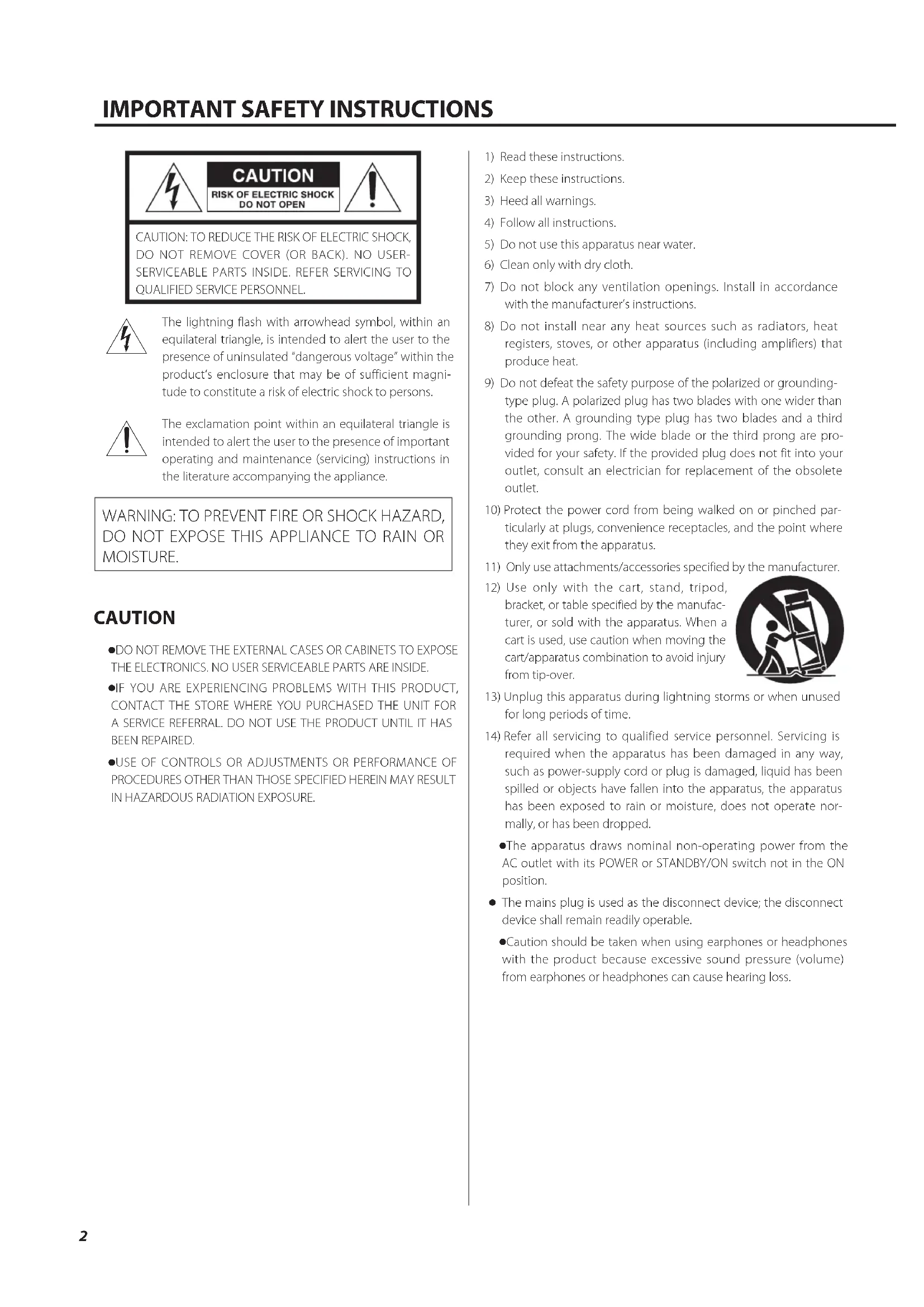 DO NOT EXPOSE THIS APPLIANCE TO RAIN OR MOISTURE. CAUTION o DO NOT REMOVE THE EXTERNAL CASES OR CABINETS TO EXPOSE THE ELECTRONICS. NO USER SERVICEABLE PARTS ARE INSIDE. o IF YOU ARE EXPERIENCING PROBLEMS WITH THIS PRODUCT, CONTACT THE STORE WHERE YOU PURCHASED THE UNIT FOR A SERVICE REFERRAL. DO NOT USE THE PRODUCT UNTIL IT HAS BEEN REPAIRED. o USE OF CONTROLS OR ADJUSTMENTS OR PERFORMANCE OF PROCEDURES OTHER THAN THOSE SPECIFIED HEREIN MAY RESULT IN HAZARDOUS RADIATION EXPOSURE.1) Read these instructions.2) Keep these instructions.3) Heed all warnings.4) Follow all instructions.5) Do not use this apparatus near water.6) Clean only with dry cloth.7) Do not block any ventilation openings. Install in accordance with the manufacturer’s instructions.8) Do not install near any heat sources such as radiators, heat registers, stoves, or other apparatus (including amplifiers) that produce heat.9) Do not defeat the safety purpose of the polarized or grounding-type plug. A polarized plug has two blades with one wider than the other. A grounding type plug has two blades and a third grounding prong. The wide blade or the third prong are pro-vided for your safety. If the provided plug does not fit into your outlet, consult an electrician for replacement of the obsolete outlet.10) Protect the power cord from being walked on or pinched par-ticularly at plugs, convenience receptacles, and the point where they exit from the apparatus.11) Only use attachments/accessories specified by the manufacturer.12) Use only with the cart, stand, tripod, bracket, or table specified by the manufac-turer, or sold with the apparatus. When a cart is used, use caution when moving the cart/apparatus combination to avoid injury from tip-over.13) Unplug this apparatus during lightning storms or when unused for long periods of time.14) Refer all servicing to qualified service personnel. Servicing is required when the apparatus has been damaged in any way, such as power-supply cord or plug is damaged, liquid has been spilled or objects have fallen into the apparatus, the apparatus has been exposed to rain or moisture, does not operate nor-mally, or has been dropped. o The apparatus draws nominal non-operating power from the AC outlet with its POWER or STANDBY/ON switch not in the ON position. o The mains plug is used as the disconnect device; the disconnect device shall remain readily operable. o Caution should be taken when using earphones or headphones with the product because excessive sound pressure (volume) from earphones or headphones can cause hearing loss.EN