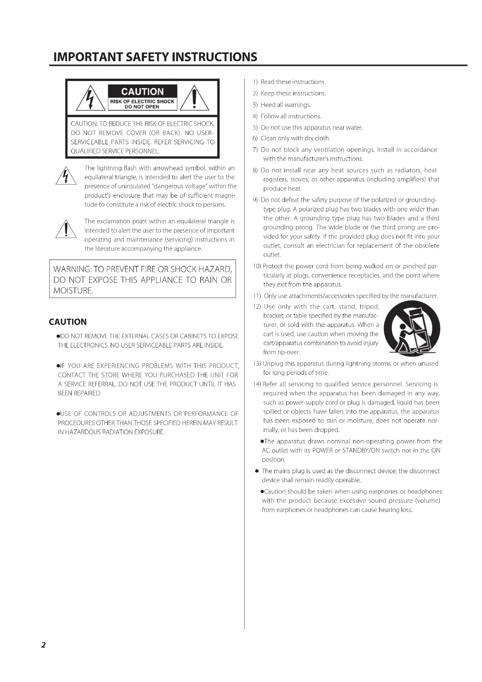DO NOT EXPOSE THIS APPLIANCE TO RAIN OR MOISTURE. CAUTION o DO NOT REMOVE THE EXTERNAL CASES OR CABINETS TO EXPOSE THE ELECTRONICS. NO USER SERVICEABLE PARTS ARE INSIDE. o IF YOU ARE EXPERIENCING PROBLEMS WITH THIS PRODUCT, CONTACT THE STORE WHERE YOU PURCHASED THE UNIT FOR A SERVICE REFERRAL. DO NOT USE THE PRODUCT UNTIL IT HAS BEEN REPAIRED. o USE OF CONTROLS OR ADJUSTMENTS OR PERFORMANCE OF PROCEDURES OTHER THAN THOSE SPECIFIED HEREIN MAY RESULT IN HAZARDOUS RADIATION EXPOSURE.