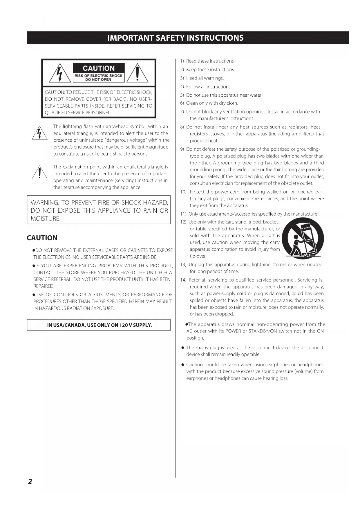 DO NOT EXPOSE THIS APPLIANCE TO RAIN OR MOISTURE. CAUTION o DO NOT REMOVE THE EXTERNAL CASES OR CABINETS TO EXPOSE THE ELECTRONICS. NO USER SERVICEABLE PARTS ARE INSIDE. o IF YOU ARE EXPERIENCING PROBLEMS WITH THIS PRODUCT, CONTACT THE STORE WHERE YOU PURCHASED THE UNIT FOR A SERVICE REFERRAL. DO NOT USE THE PRODUCT UNTIL IT HAS BEEN REPAIRED. o USE OF CONTROLS OR ADJUSTMENTS OR PERFORMANCE OF PROCEDURES OTHER THAN THOSE SPECIFIED HEREIN MAY RESULT IN HAZARDOUS RADIATION EXPOSURE.IN USA/CANADA, USE ONLY ON 120 V SUPPLY.1) Read these instructions.2) Keep these instructions.3) Heed all warnings.4) Follow all instructions.5) Do not use this apparatus near water.6) Clean only with dry cloth.7) Do not block any ventilation openings. Install in accordance with the manufacturer’s instructions.8) Do not install near any heat sources such as radiators, heat registers, stoves, or other apparatus (including amplifiers) that produce heat.9) Do not defeat the safety purpose of the polarized or grounding-type plug. A polarized plug has two blades with one wider than the other. A grounding type plug has two blades and a third grounding prong. The wide blade or the third prong are provided for your safety. If the provided plug does not fit into your outlet, consult an electrician for replacement of the obsolete outlet.