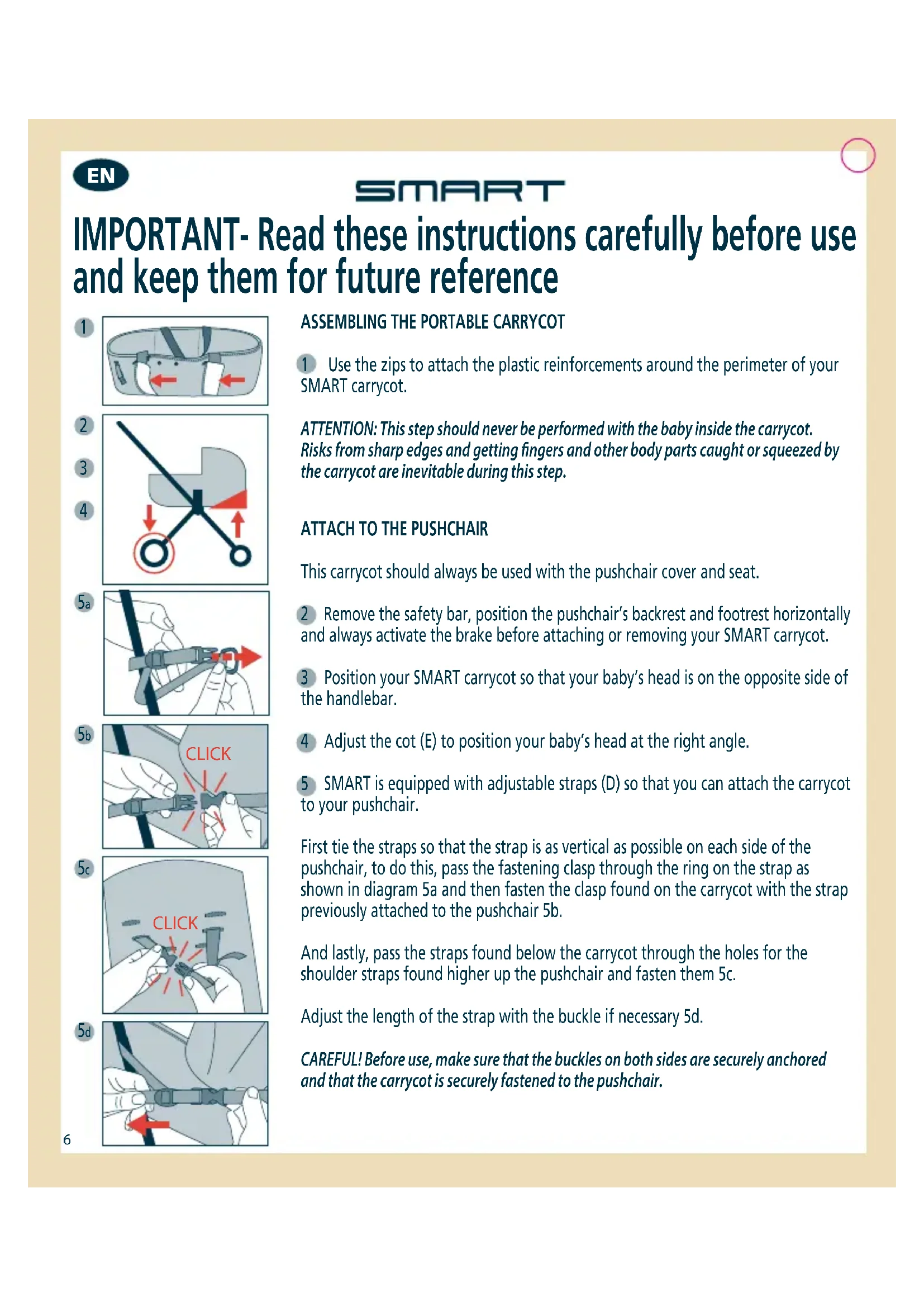 This carrycot should always be used with the pushchair cover and seat. 2 Remove the safety bar, position the pushchair’s backrest and footrest horizontally and always activate the brake before attaching or removing your SMART carrycot. 3 Position your SMART carrycot so that your baby’s head is on the opposite side of the handlebar. 4 Adjust the cot (E) to position your baby’s head at the right angle. 5 SMART is equipped with adjustable straps (D) so that you can attach the carrycot to your pushchair. First tie the straps so that the strap is as vertical as possible on each side of the pushchair, to do this, pass the fastening clasp through the ring on the strap as shown in diagram 5a and then fasten the clasp found on the carrycot with the strap previously attached to the pushchair 5b. And lastly, pass the straps found below the carrycot through the holes for the shoulder straps found higher up the pushchair and fasten them 5c. Adjust the length of the strap with the buckle if necessary 5d. CAREFUL! Before use, make sure that the buckles on both sides are securely anchored and that the carrycot is securely fastened to the pushchair. IMPORTANT- Read these instructions carefully before use and keep them for future reference