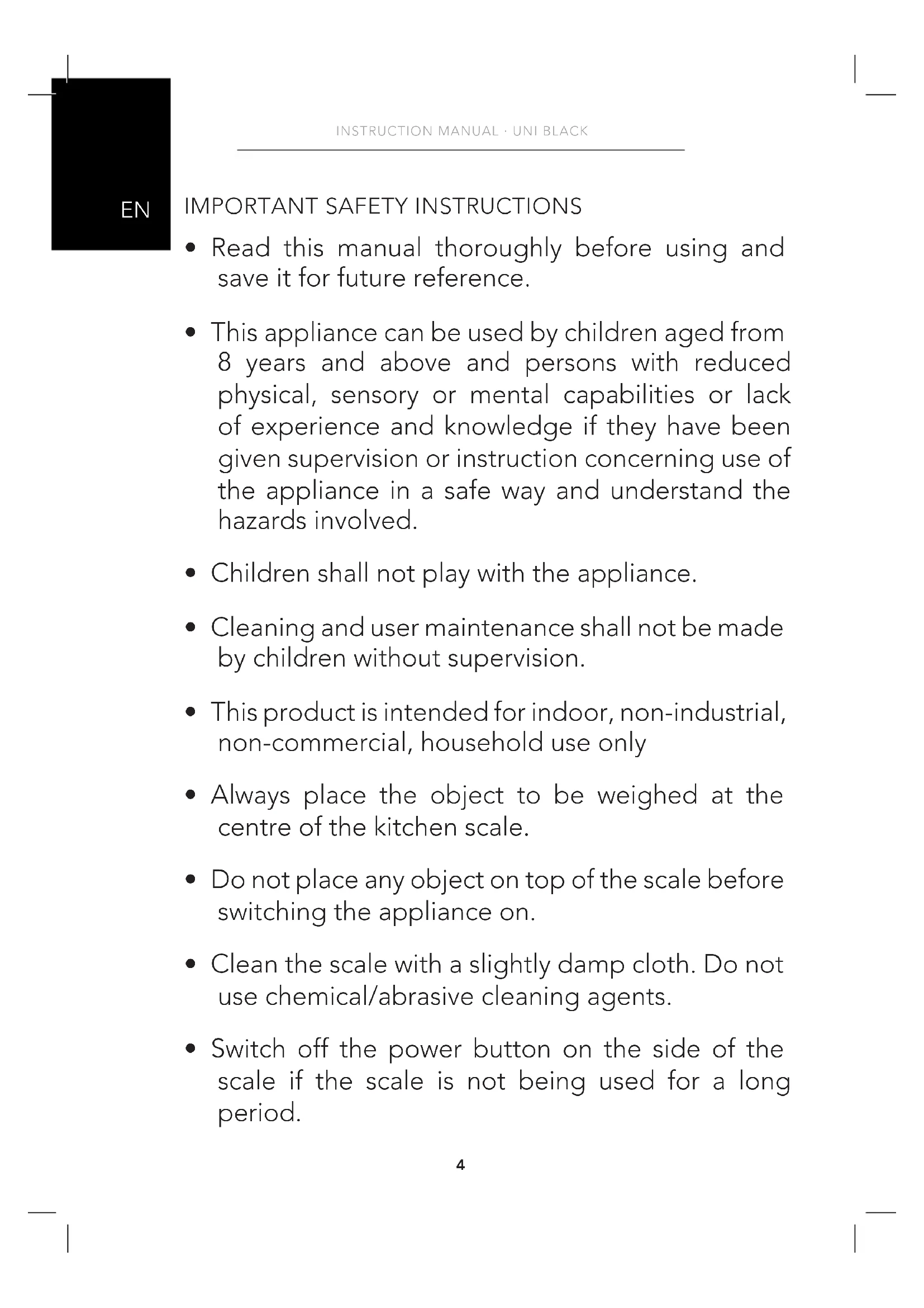 CLEANING Clean the scale with a soft slightly damp cloth. Never use hot water or any harsh chemicals. STORAGE