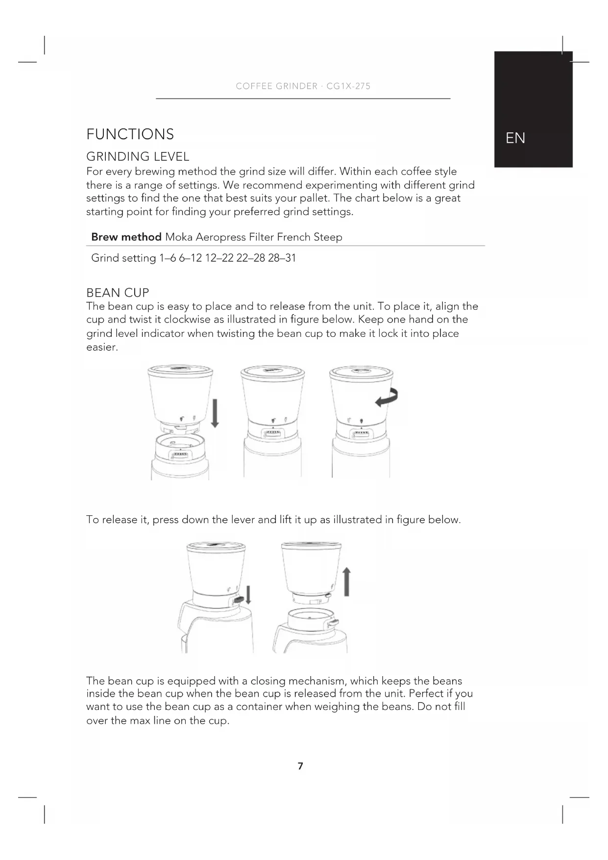 FUNCTIONS GRINDING LEVEL For every brewing method the grind size will differ. Within each coffee style there is a range of settings. We recommend experimenting with different grind settings to nd the one that best suits your pallet. The chart below is a great starting point for nding your preferred grind settings. BEAN CUP The bean cup is easy to place and to release from the unit. To place it, align the cup and twist it clockwise as illustrated in gure below. Keep one hand on the grind level indicator when twisting the bean cup to make it lock it into place easier. To release it, press down the lever and lift it up as illustrated in gure below. The bean cup is equipped with a closing mechanism, which keeps the beans inside the bean cup when the bean cup is released from the unit. Perfect if you want to use the bean cup as a container when weighing the beans. Do not ll over the max line on the cup. Brew method Moka Aeropress Filter French Steep Grind setting 1–6 6–12 12–22 22–28 28–318