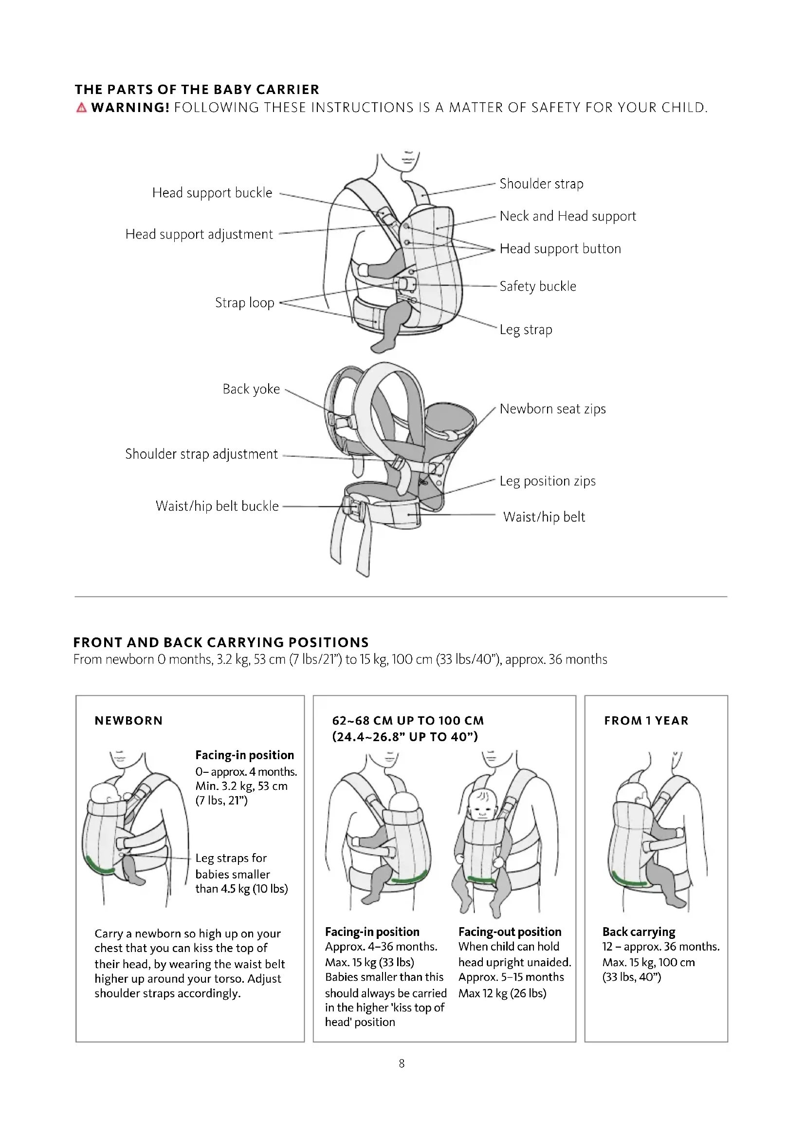 From newborn 0 months, 3.2 kg, 53 cm (7 lbs/21”) to 15 kg, 100 cm (33 lbs/40”), approx. 36 months Facing-out position When child can hold head upright unaided. Approx. 5–15 months Max 12 kg (26 lbs) Back carrying 12 – approx. 36 months. Max. 15 kg, 100 cm (33 lbs, 40”) Facing-in position Approx. 4–36 months. Max. 15 kg (33 lbs) Babies smaller than this should always be carried in the higher 'kiss top of head' position Head support buckle Strap loop Shoulder strap Neck and Head support Head support button Safety buckle Leg strap Back yoke Waist/hip belt buckle Shoulder strap adjustment Leg position zips Waist/hip belt Newborn seat zips Head support adjustment NEWBORN Carry a newborn so high up on your chest that you can kiss the top of their head, by wearing the waist belt higher up around your torso. Adjust shoulder straps accordingly. Facing-in position 0– approx. 4 months. Min. 3.2 kg, 53 cm (7 lbs, 21”) Leg straps for babies smaller than 4.5 kg (10 lbs)