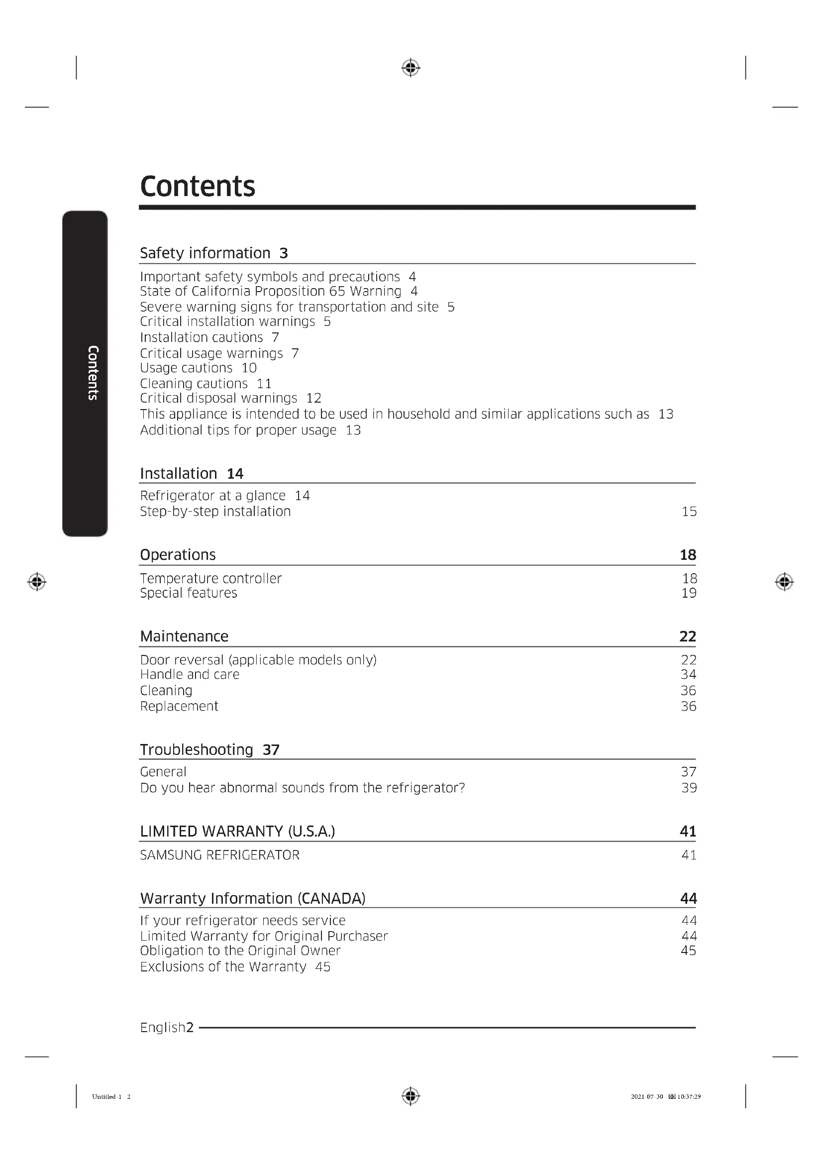 Refrigerator User manual RT16A61**** Free Standing Appliance Untitled-1 1 2021-07-30 10:37:29English2 Contents Contents Safety information 3 Important safety symbols and precautions 4 State of California Proposition 65 Warning 4 Severe warning signs for transportation and site 5 Critical installation warnings 5 Installation cautions 7 Critical usage warnings 7 Usage cautions 10 Cleaning cautions 11 Critical disposal warnings 12 This appliance is intended to be used in household and similar applications such as 13 Additional tips for proper usage 13 Installation 14 Refrigerator at a glance 14 Step-by-step installation 15 Operations 18 Temperature controller 18 Special features 19 Maintenance 22 Door reversal (applicable models only) 22 Handle and care 34 Cleaning 36 Replacement 36 Troubleshooting 37 General 37 Do you hear abnormal sounds from the refrigerator? 39