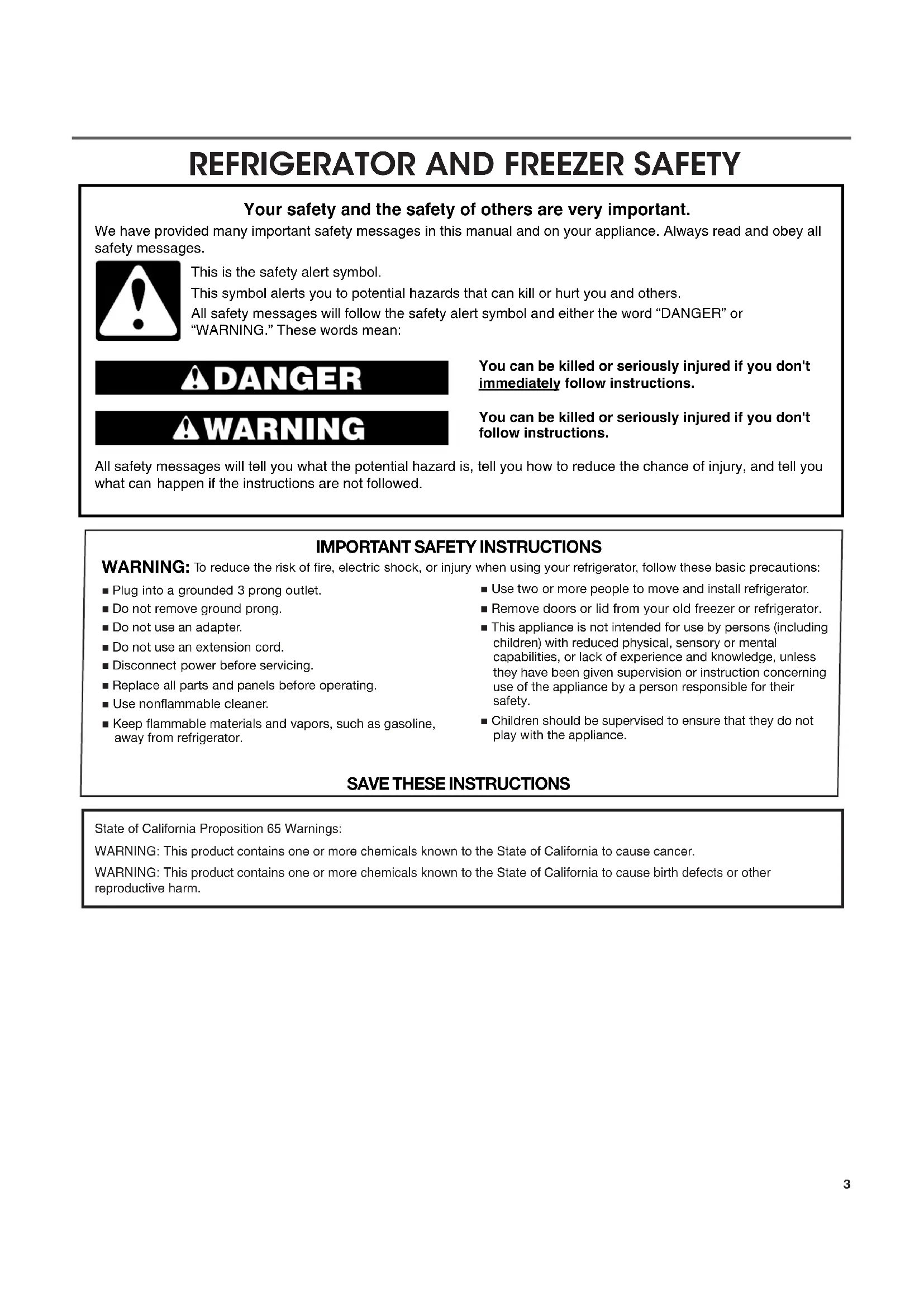 State of California Proposition 65 Warnings:WARNING: This product contains one or more chemicals known to the State of California to cause cancer.WARNING: This product contains one or more chemicals known to the State of California to cause birth defects or other reproductive harm. You can be killed or seriously injured if you don't immediately follow instructions. You can be killed or seriously injured if you don't follow instructions. All safety messages will tell you what the potential hazard is, tell you how to reduce the chance of injury, and tell you what can happen if the instructions are not followed. Your safety and the safety of others are very important. We have provided many important safety messages in this manual and on your appliance. Always read and obey all safety messages. This is the safety alert symbol. This symbol alerts you to potential hazards that can kill or hurt you and others. All safety messages will follow the safety alert symbol and either the word “DANGER” or “WARNING.” These words mean:
