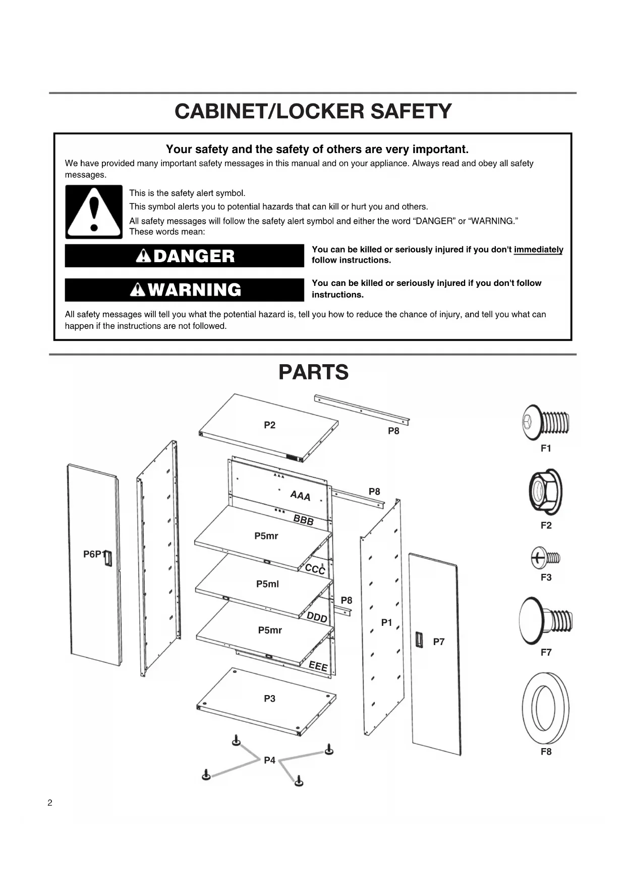DDD EEE CCC3 ASSEMBLY INSTRUCTIONS Tools and Parts Gather the required tools and parts before starting installation.Tools Needed: ■ 1/2" Wrench ■ Level ■ Phillips screwdriverTools Supplied: ■ Hex key ■ Key Cabinet Use Requirements ■ Intended for use in a garage. ■ Maximum weight limit is 50 lbs (22.7 kg) for each shelf. ■ Maximum weight limit is 300 lbs (136 kg) for the cabinet. Unpack the Cabinet 1. Remove and verify the contents. Contents include a hex key, a key, and the parts and fasteners shown in “Parts.”2. Dispose of/recycle all packaging materials. Assemble Cabinet IMPORTANT: Two people may be required to complete the assembly. As you assemble the cabinet, make sure the edges with the holes are facing up. If you are assembling the cabinet on the oor, fasten the eight front corner bolts, two at each corner, after you stand the cabinet upright. WARNING Excessive Weight HazardUse two or more people to move, assemble or install cabinet.Failure to do so can result in back or other injury.