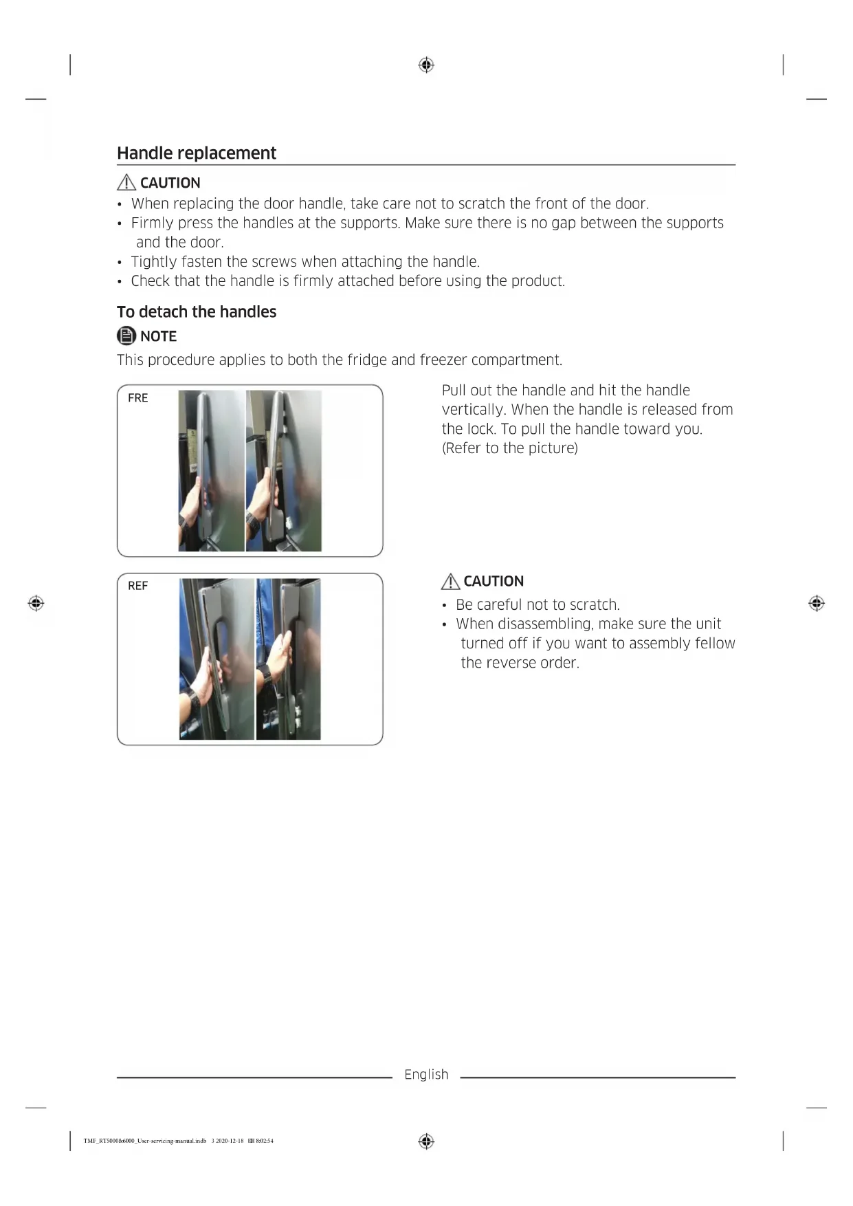 - Check that the handle is firmly attached before using the product. To detach the handles NOTE This procedure applies to both the fridge and freezer compartment. FRE Pull out the handle and hit the handle vertically. When the handle is released from the lock. To pull the handle toward you. (Refer to the picture) REF CAUTION
