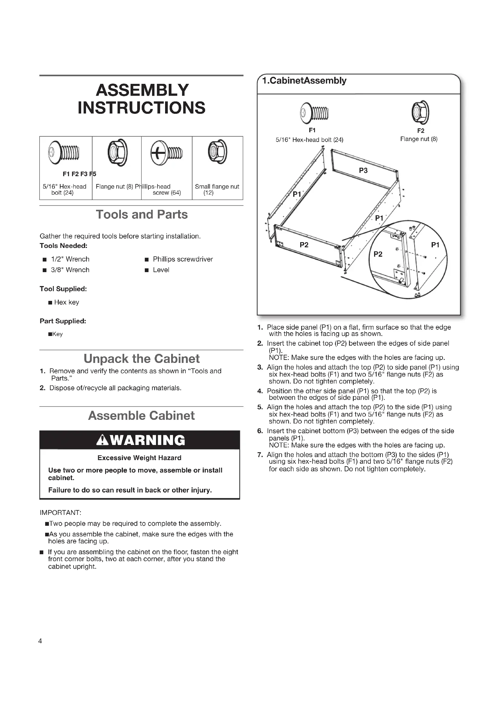 PARTS4 ASSEMBLY INSTRUCTIONS Tools and Parts Gather the required tools before starting installation.Tools Needed: ■ 1/2" Wrench ■ Phillips screwdriver ■ 3/8" Wrench ■ Level Tool Supplied: ■ Hex keyPart Supplied: ■ Key Unpack the Cabinet 1. Remove and verify the contents as shown in “Tools and Parts.”2. Dispose of/recycle all packaging materials.1. Place side panel (P1) on a at, rm surface so that the edge with the holes is facing up as shown.2. Insert the cabinet top (P2) between the edges of side panel (P1). NOTE: Make sure the edges with the holes are facing up.3. Align the holes and attach the top (P2) to side panel (P1) using six hex-head bolts (F1) and two 5/16" ange nuts (F2) as shown. Do not tighten completely.4. Position the other side panel (P1) so that the top (P2) is between the edges of side panel (P1).5. Align the holes and attach the top (P2) to the side (P1) using six hex-head bolts (F1) and two 5/16" ange nuts (F2) as shown. Do not tighten completely.6. Insert the cabinet bottom (P3) between the edges of the side panels (P1). NOTE: Make sure the edges with the holes are facing up.7. Align the holes and attach the bottom (P3) to the sides (P1) using six hex-head bolts (F1) and two 5/16" ange nuts (F2) for each side as shown. Do not tighten completely.