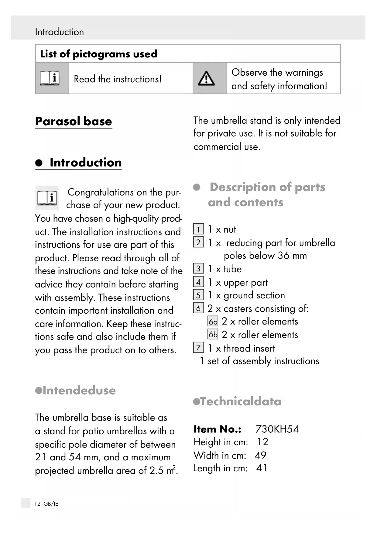 1 x thread insert 1 set of assembly instructions Technical data Item No.: 730KH54 Height in cm: 12 Width in cm: 49 Length in cm: 41 Introduction / Safety notes13 GB/IE Introduction Introduction / Safety notes Compatible pole diameters in mm: 21–54 Weight in kg: approx. 30 when fully filled with sand Pole geometry in connection area: round max. umbrella weight in kg: 5 max. umbrella surface: 2.5 m