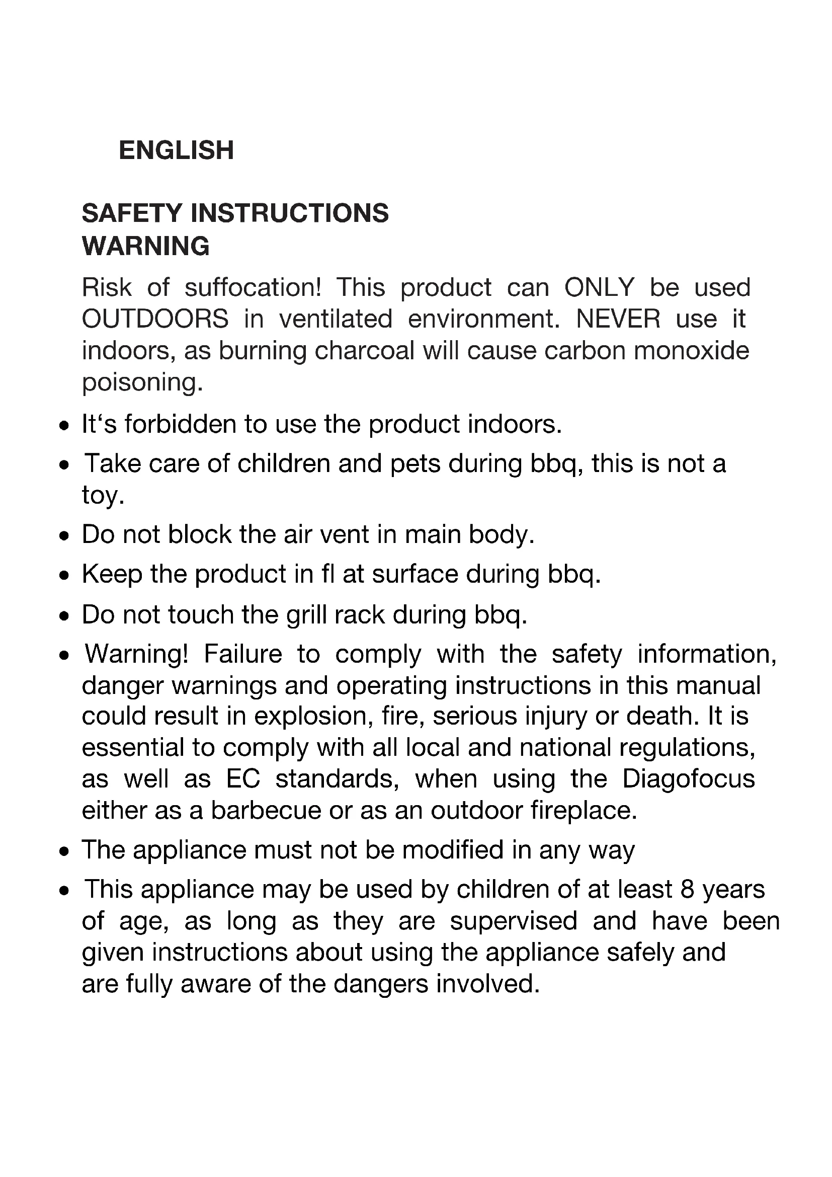 - Warning! Failure to comply with the safety information, danger warnings and operating instructions in this manual could result in explosion, fire, serious injury or death. It is essential to comply with all local and national regulations, as well as EC standards, when using the Diagofocus either as a barbecue or as an outdoor fireplace.