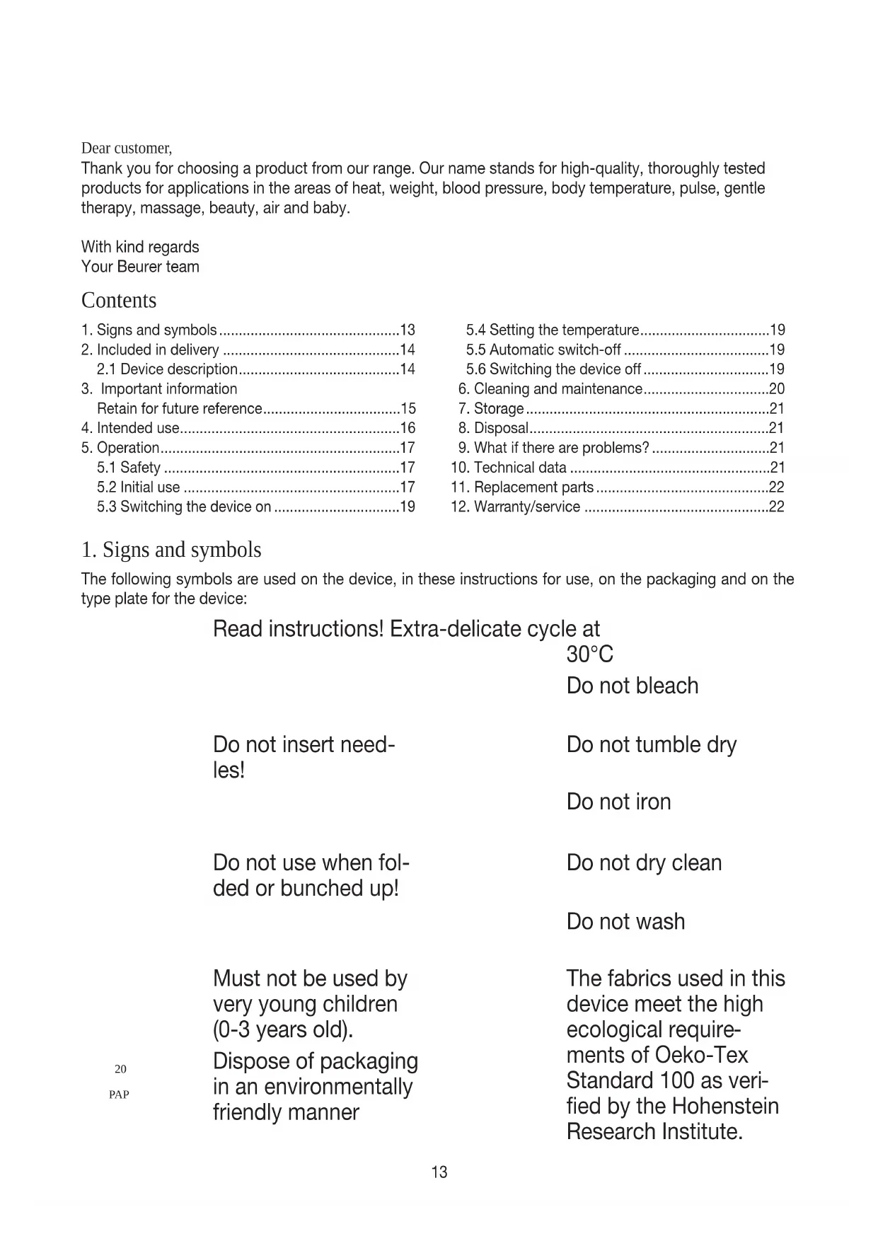 The following symbols are used on the device, in these instructions for use, on the packaging and on the type plate for the device: Read instructions! Extra-delicate cycle at 30°C Do not bleach Do not insert need- les! Do not tumble dry Do not iron Do not use when fol- ded or bunched up! Do not dry clean Do not wash Must not be used by very young children (0-3 years old). The fabrics used in this device meet the high ecological require