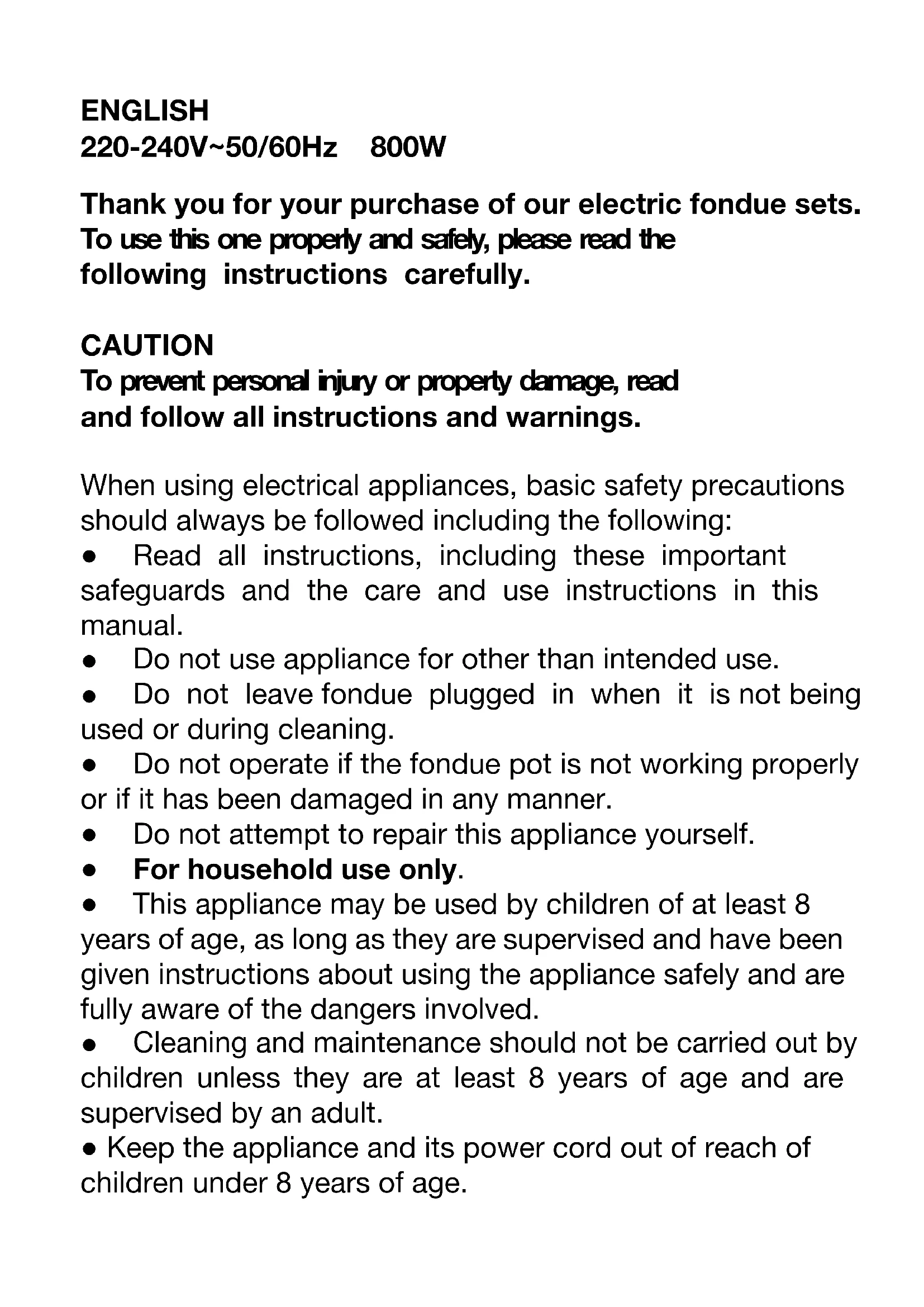 Thank you for your purchase of our electric fondue sets. To use this one properly and safely, please read the following instructions carefully. CAUTION To prevent personal injury or property damage, read and follow all instructions and warnings.