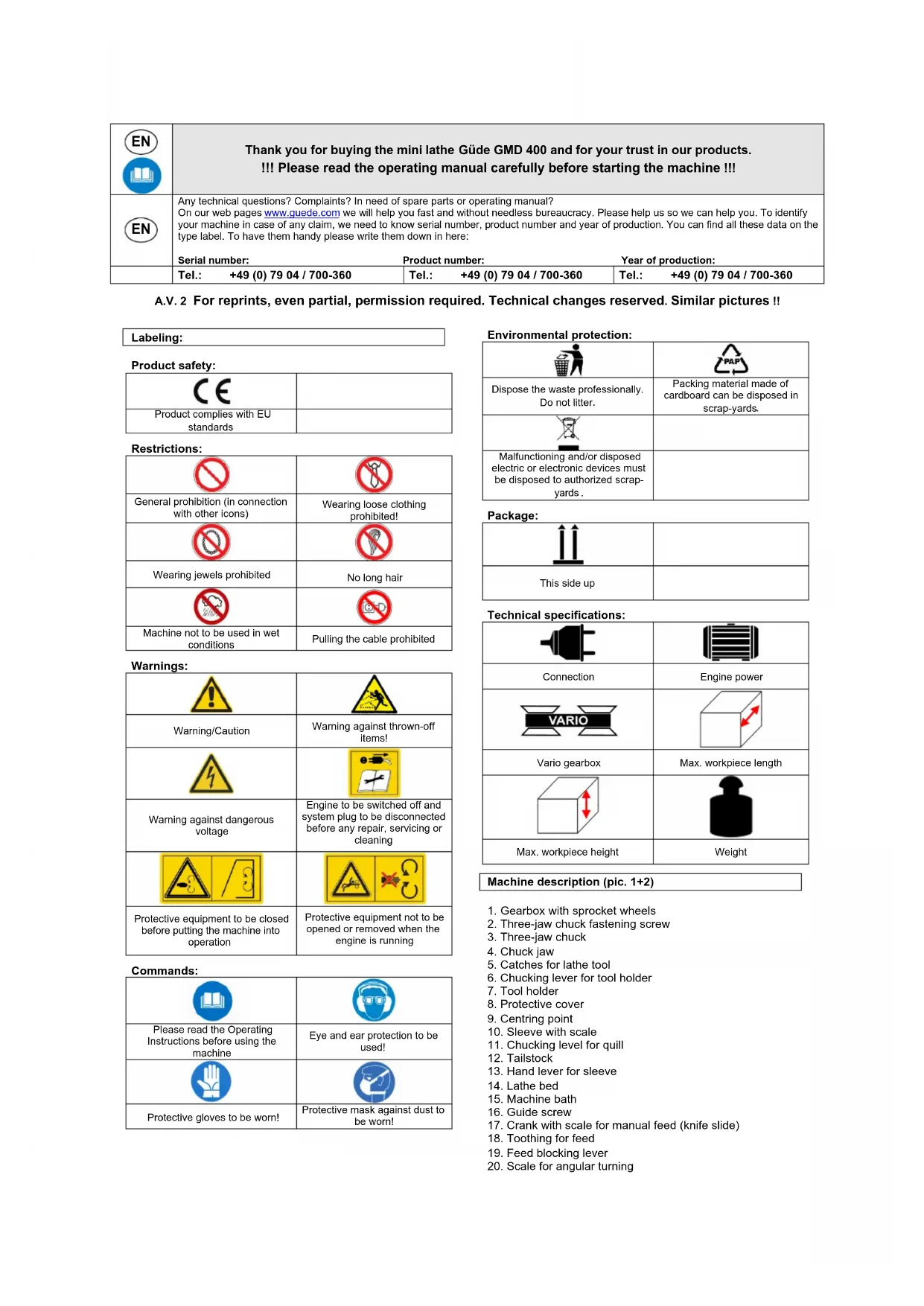 Thank you for buying the mini lathe Güde GMD 400 and for your trust in our products. !!! Please read the operating manual carefully before starting the machine !!!