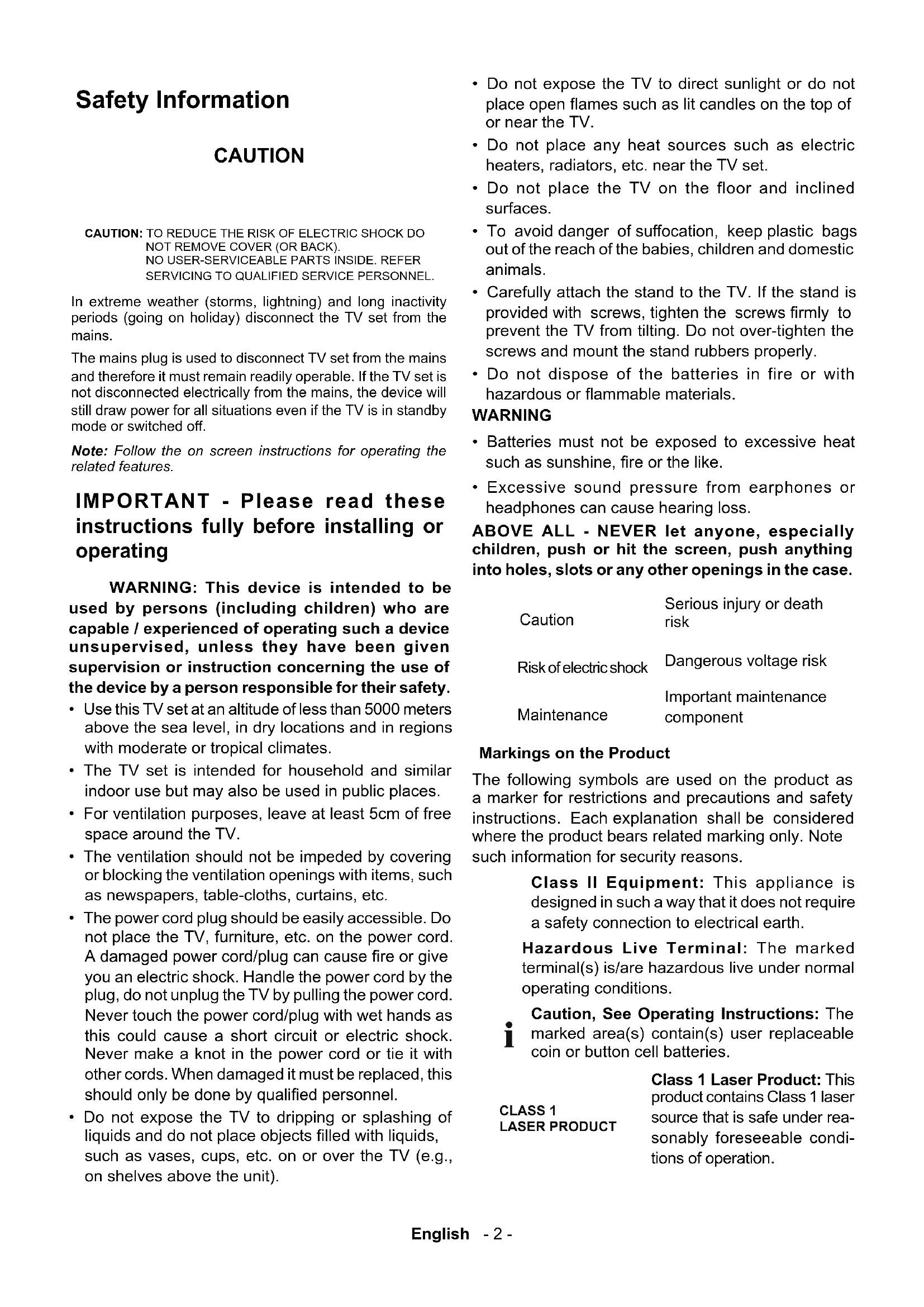 - Excessive sound pressure from earphones or headphones can cause hearing loss. ABOVE ALL - NEVER let anyone, especially children, push or hit the screen, push anything into holes, slots or any other openings in the case. CautionSerious injury or death risk Risk of electric shockDangerous voltage risk MaintenanceImportant maintenance component Markings on the Product The following symbols are used on the product as a marker for restrictions and precautions and safety instructions. Note such information for security reasons. Class II Equipment: This appliance is designed in such a way that it does not require a safety connection to electrical earth. Hazardous Live Terminal: The marked terminal(s) is/are hazardous live under normal operating conditions.