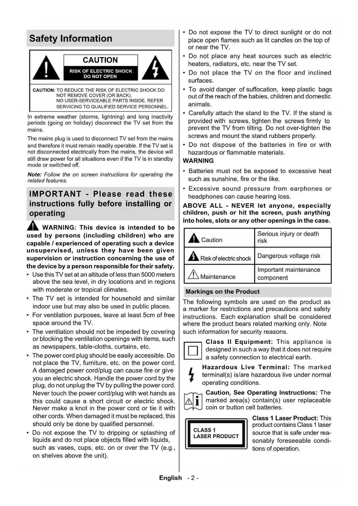 Disposal Information ...........................................32English - 2 - Safety Information CAUTION RISK OF ELECTRIC SHOCKDO NOT OPENCAUTION: TO REDUCE THE RISK OF ELECTRIC SHOCK DO NOT REMOVE COVER (OR BACK). NO USER-SERVICEABLE PARTS INSIDE. REFER SER VICING TO QUALIFIED SERVICE PERSONNEL.Note: Follow the on screen instructions for operating the related features.In extreme weather (storms, lightning) and long inactivity periods (going on holiday) disconnect the TV set from the mains.The mains plug is used to disconnect TV set from the mains and therefore it must remain readily operable. If the TV set is not disconnected electrically from the mains, the device will still draw power for all situations even if the TV is in standby IMPORTANT - Please read these instructions fully before installing or operating