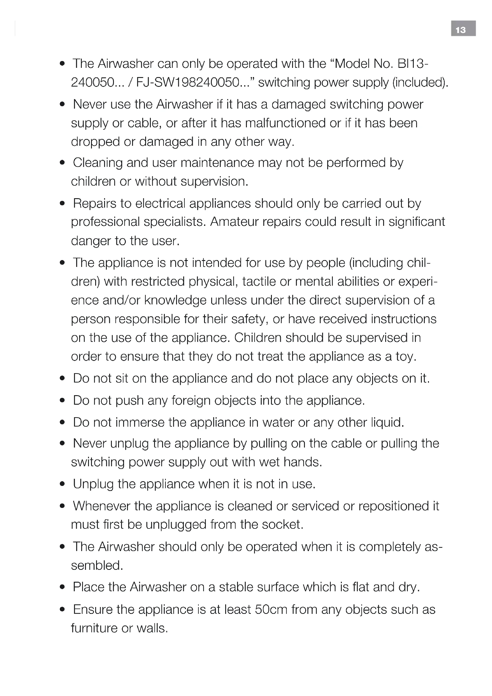 - The Airwasher can only be operated with the “Model No. BI13- 240050... / FJ-SW198240050...” switching power supply (included).