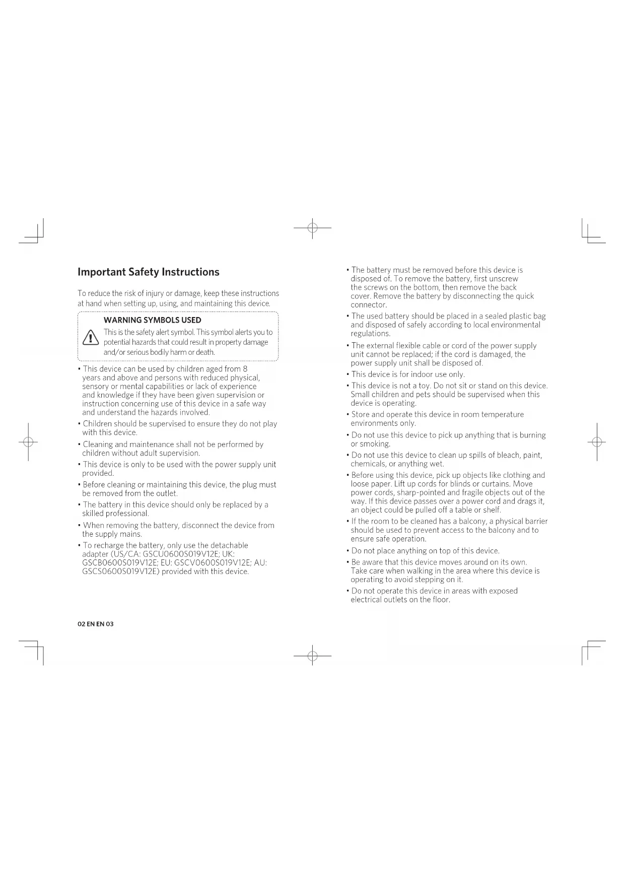 - Do not operate this device in areas with exposed electrical outlets on the floor.04 EN EN 05