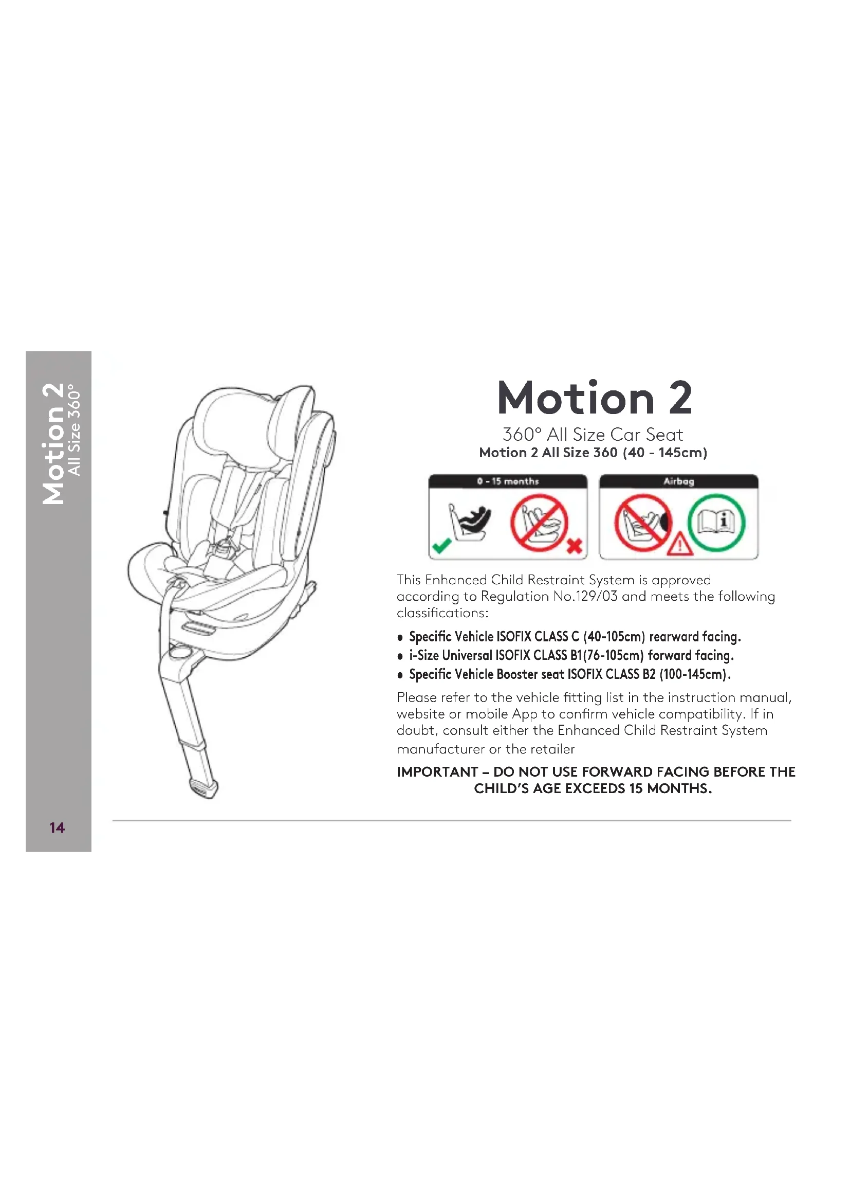 Motion 2 All Size 360º This Enhanced Child Restraint System is approved according to Regulation No.129/03 and meets the following classications:• Specic Vehicle ISOFIX CLASS C (40-105cm) rearward facing. • i-Size Universal ISOFIX CLASS B1(76-105cm) forward facing.• Specic Vehicle Booster seat ISOFIX CLASS B2 (100-145cm).Please refer to the vehicle tting list in the instruction manual, website or mobile App to conrm vehicle compatibility. If in doubt, consult either the Enhanced Child Restraint System manufacturer or the retailerIMPORTANT – DO NOT USE FORWARD FACING BEFORE THE CHILD’S AGE EXCEEDS 15 MONTHS. Motion 2 360° All Size Car Seat Motion 2 All Size 360 (40 - 145cm)INSTALLING THE CHILD SEAT