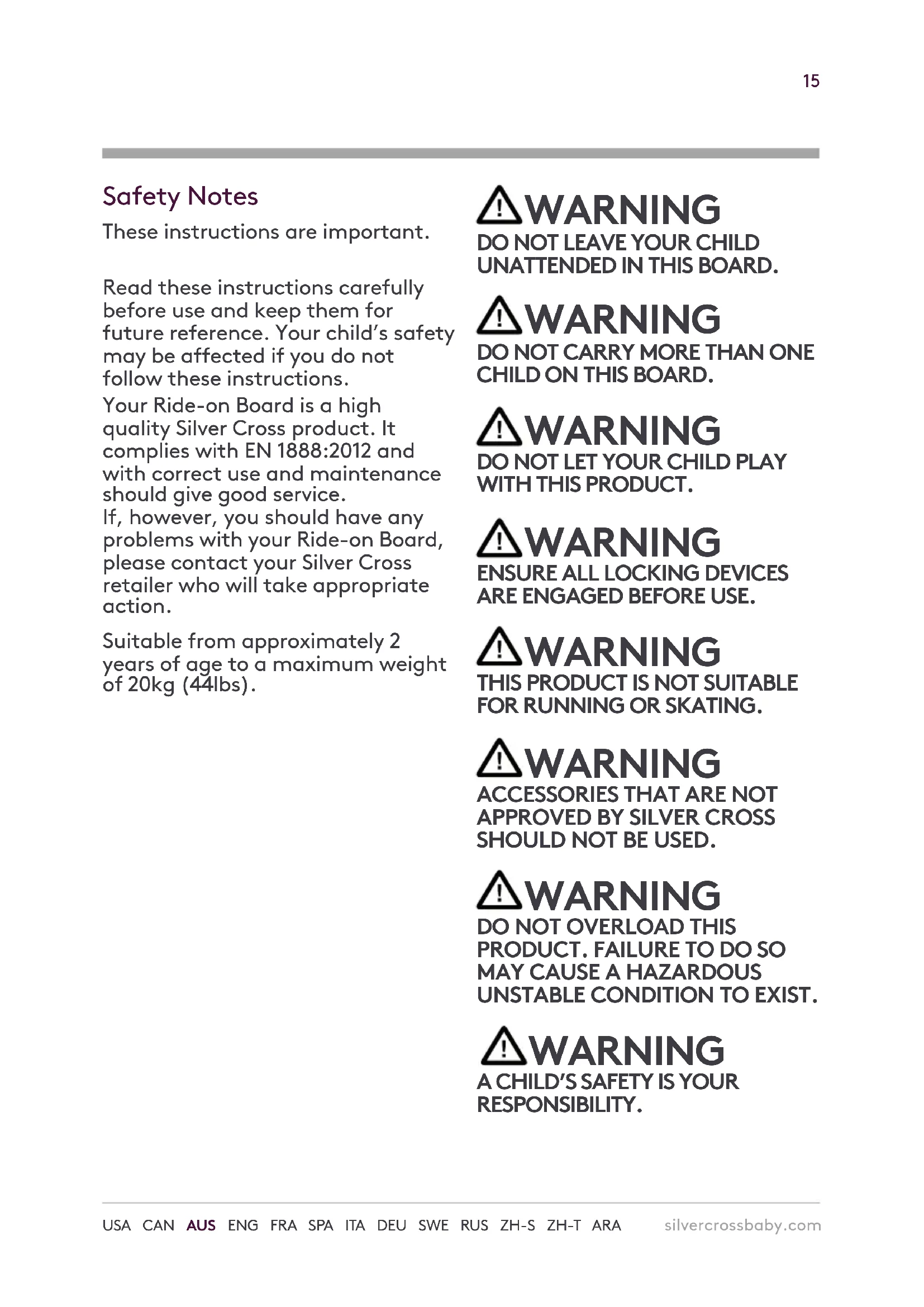 (SEE 1.1)12 If somebody unfamiliar is using your Ride-on Board always ensure that they read these instructions carefully so that they understand how the product works best. The child should be clear of moving parts while making adjustments. Only to be used with the Silver Cross Wave & Coast chassis. Ensure the brake is engaged before attaching your Ride-on Board to the chassis (see 1.2). Ensure the red buttons on either side of the locking mechanism have popped out completely. We advise that the Ride-on Board is detached before folding your Wave / Coast chassis. Care and Maintenance Always check your Ride-on Board for signs of wear. Regularly lubricate all moving parts. Check for freedom of movement of all locking devices. Polish metal work with a clean, dry cloth. Clean wheels with wet cloth and dry. USA CAN AUS ENG FRA SPA ITA DEU SWE RUS ZH-S ZH-T ARA13 silvercrossbaby.com USA CAN AUS ENG FRA SPA ITA DEU SWE RUS ZH-S ZH-T ARA IMPORTANT : CONSERVEZ CETTE NOTICE