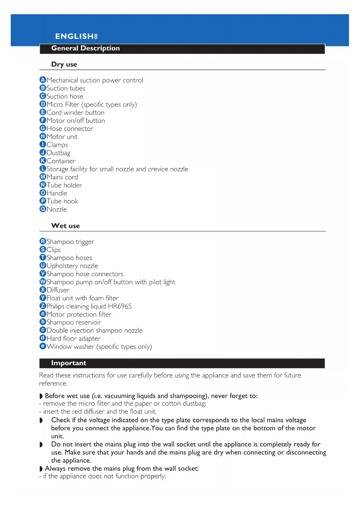 TRIATHLONGeneral Description Dry use A Mechanical suction power control B Suction tubes C Suction hose D Micro Filter (specific types only) E Cord winder button F Motor on/off button G Hose connector H Motor unit I Clamps J Dustbag K Container L Storage facility for small nozzle and crevice nozzle M Mains cord N Tube holder O Handle P Tube hook Q Nozzle Wet use R Shampoo trigger S Clips T Shampoo hoses U Upholstery nozzle V Shampoo hose connectors W Shampoo pump on/off button with pilot light X Diffuser Y Float unit with foam filter Z Philips cleaning liquid HR6965 a Motor protection filter b Shampoo reservoir c Double injection shampoo nozzle d Hard floor adapter e Window washer (specific types only) Important Read these instructions for use carefully before using the appliance and save them for future reference. ◗ Before wet use (i.e. vacuuming liquids and shampooing), never forget to: - remove the micro filter and the paper or cotton dustbag; - insert the red diffuser and the float unit. ◗ Check if the voltage indicated on the type plate corresponds to the local mains voltage before you connect the appliance.You can find the type plate on the bottom of the motor unit. ◗ Do not insert the mains plug into the wall socket until the appliance is completely ready for use. Make sure that your hands and the mains plug are dry when connecting or disconnecting the appliance. ◗ Always remove the mains plug from the wall socket: - if the appliance does not function properly; ENGLISH8- before cleaning the appliance; - before opening the container. ◗ Only vacuum dry materials and dust if the paper or cotton dustbag has been inserted into the appliance . ◗ Never vacuum ashes (from ashtrays and fireplaces) until they are completely cold. ◗ Never vacuum petrol, white spirit, gas oil, paraffin oil or other inflammable or explosive liquids. ◗ Do not use the appliance in rooms with explosive vapours (petrol, thinners, solvents). ◗ When vacuuming ashes, fine sand, lime, cement dust and similar substances, the pores of the paper dustbag may become clogged. In this case the paper dustbag must be replaced, even if is not full yet. ◗ Only use Athena paper dustbags or the cotton dustbag. Dustbags can be obtained from your dealer. For type numbers, see the table in 'Accessories' . ◗ Do not use the vacuum cleaner without the motor protection filter. ◗ Never immerse the motor unit in water. ◗ Never point the jet of shampoo at plugs, sockets or electrical appliances. ◗ Only switch the pump on if the shampoo reservoir has been filled, placed into the appliance and connected by means of the two shampoo hoses. Switch the pump off as soon as the shampoo reservoir is empty. The pump may get damaged if it runs dry. ◗ Keep the appliance and the cleaning liquid out of reach of children. ◗ Always switch the appliance off after use and remove the mains plug from the wall socket. ◗ Always empty, clean and dry the container after wet use. Let the appliance suck in dry air for few minutes to dry the inside of the tubes and hose.This prevents an unpleasant smell from occuring the next time you use the vacuum cleaner. It also prevents the paper dustbag from becoming wet. ◗ To extend its life, the shampoo pump should be cleaned with a mixture of water and white vinegar once a year. Follow the instructions in chapter 'Cleaning and maintenance'. ◗ Do not store the appliance at temperatures below 0cC to prevent it from freezing. ◗ Do not point the hose at the eyes or ears nor put it in your mouth when the vacuum cleaner is switched on and the hose is connected to the vacuum cleaner. ◗ If the mains cord or another part of this appliance is damaged, it must only be replaced by Philips or a service centre authorised by Philips in order to avoid hazardous situations. ◗ Noise level: Lc= 81 dB [A] Preparing for use Connecting and disconnecting accessories Hose 1 To connect the hose, insert it into the hose connector while turning it clockwise a little (fig. 1). 2 To disconnect the hose, pull it out of the hose connector while turning it anticlockwise a little (fig. 2). Tube 1 To connect the tube, press the spring-loaded button and insert the narrow section into the wider section.The button will pop up when inserted properly into the opening (fig. 3). 2 To disconnect the tube, press the spring-loaded button and pull the sections away from each other. Nozzle 1 You can connect the nozzle to the tube (fig. 30). 2 If you wish to have the nozzle close at hand (e.g. to clean stairs, upholstery, tapestries), you can connect the nozzle directly to the handgrip (fig. 4). ENGLISH 9Dry or wet vacuuming Prepare the vacuum cleaner for either dry vacuuming or wet vacuuming.