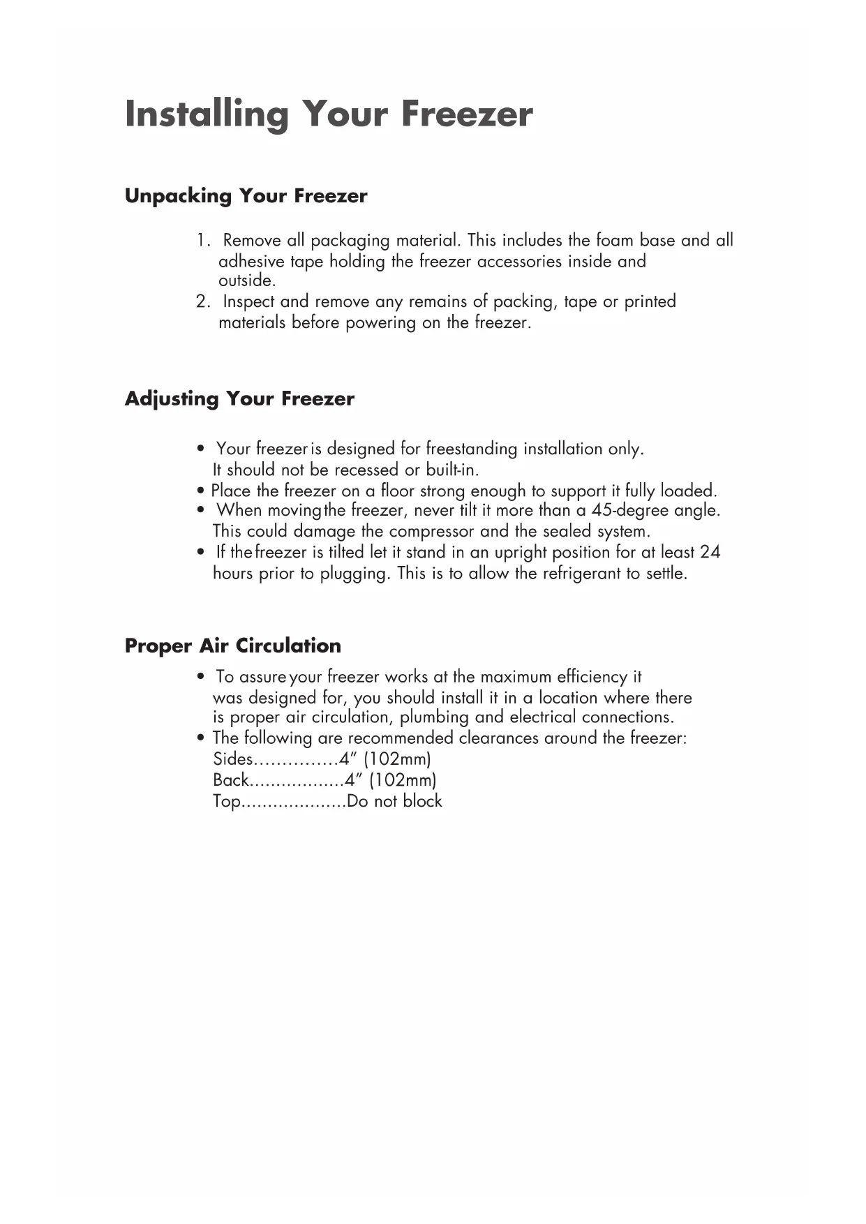 The following are recommended clearances around the freezer: Sides……………4” (102mm) Back..................4” (102mm) Top....................Do not block Unpacking Your Freezer Adjusting Your Freezer Proper Air Circulation Installing Your FreezerElectrical Requirement