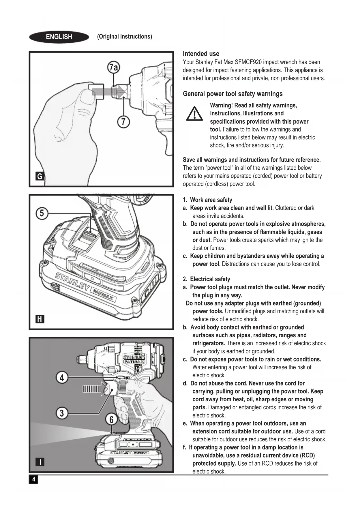 Intended use Your Stanley Fat Max SFMCF920 impact wrench has been designed for impact fastening applications. This appliance is intended for professional and private, non professional users. General power tool safety warnings