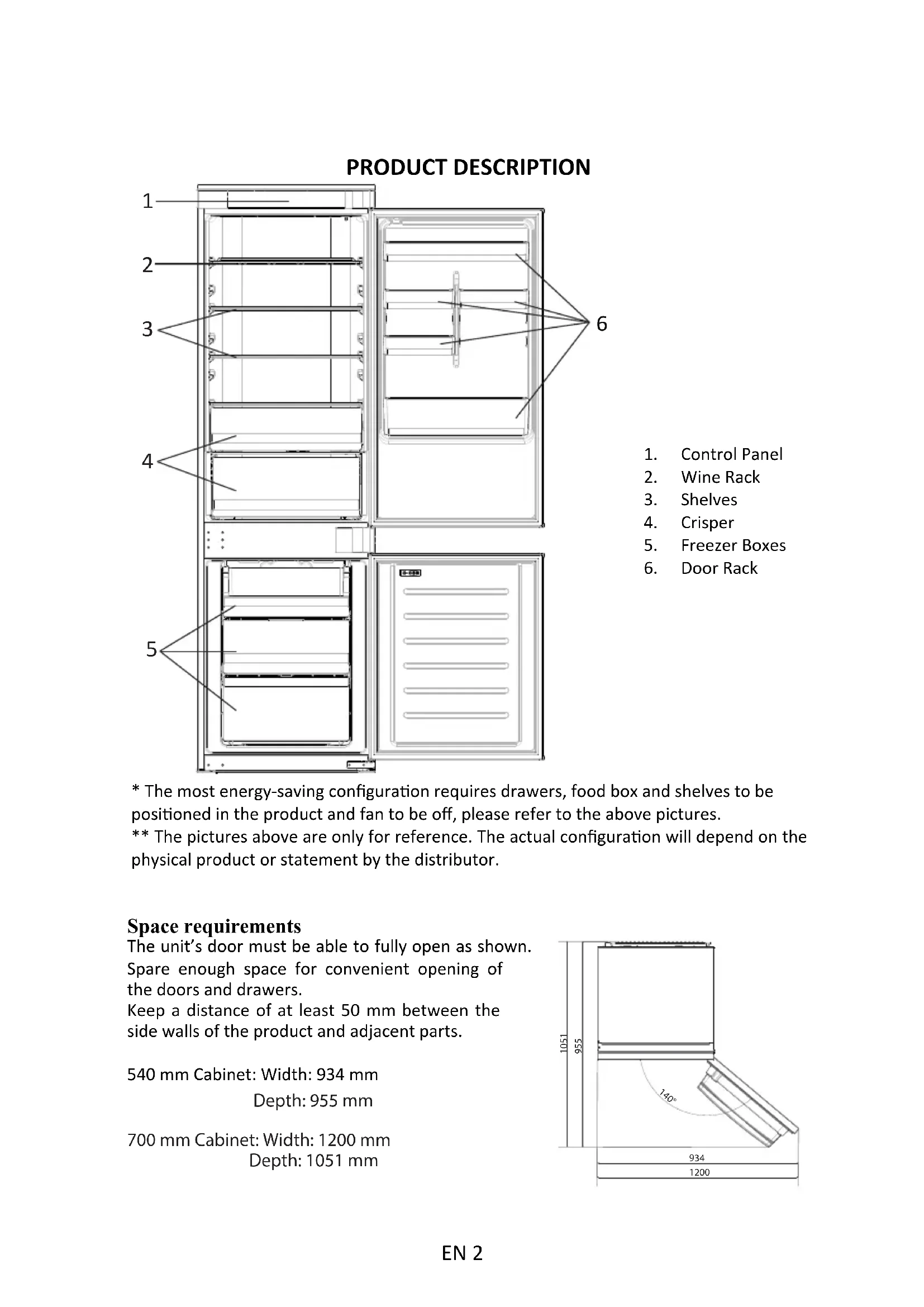- The most energy-saving configuraon requires drawers, food box and shelves to be posioned in the product and fan to be off, please refer to the above pictures. ** The pictures above are only for reference. The actual configuraon will depend on the physical product or statement by the distributor.Space requirements The unit’s door must be able to fully open as shown. Spare enough space for convenient opening of the doors and drawers. Keep a distance of at least 50 mm between the side walls of the product and adjacent parts. 540 mm Cabinet: Width: 934 mm