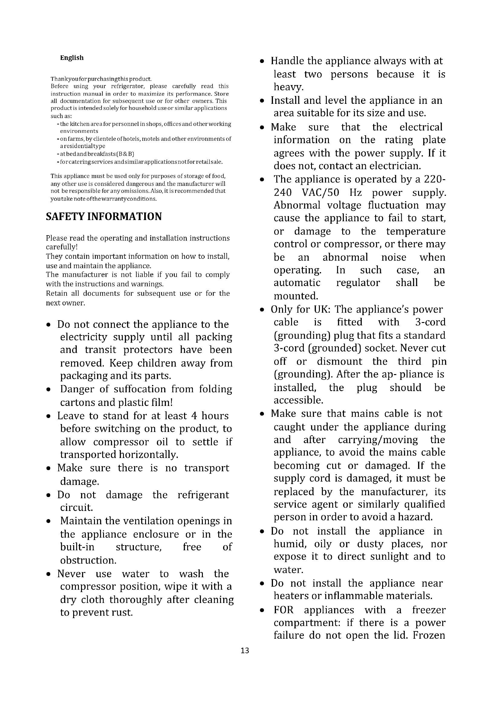 - FOR appliances with a freezer compartment: never put frozen food straight from the freezer compartment in your mouth. Risk of low-temperature burns!