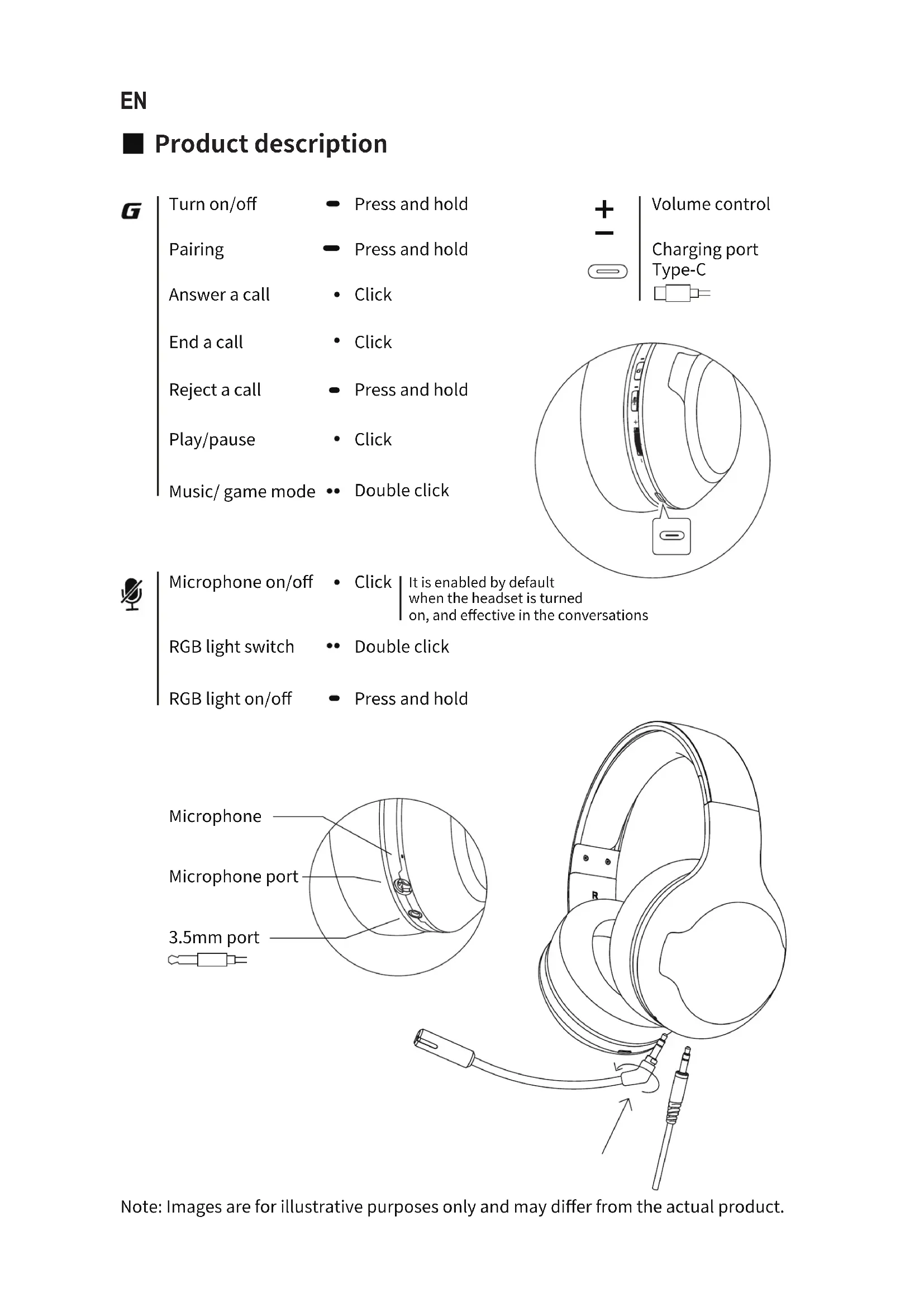Microphone Microphone port 3.5mm port Microphone on/off Turn on/off Pairing Answer a call End a call Reject a call Play/pause Music/ game mode RGB light switch RGB light on/off Press and hold Press and hold Click Click Press and hold Click Double click It is enabled by default when the headset is turned on, and effective in the conversations Click Double click Press and hold Charging port Type-C Volume control Note: Images are for illustrative purposes only and may differ from the actual product.