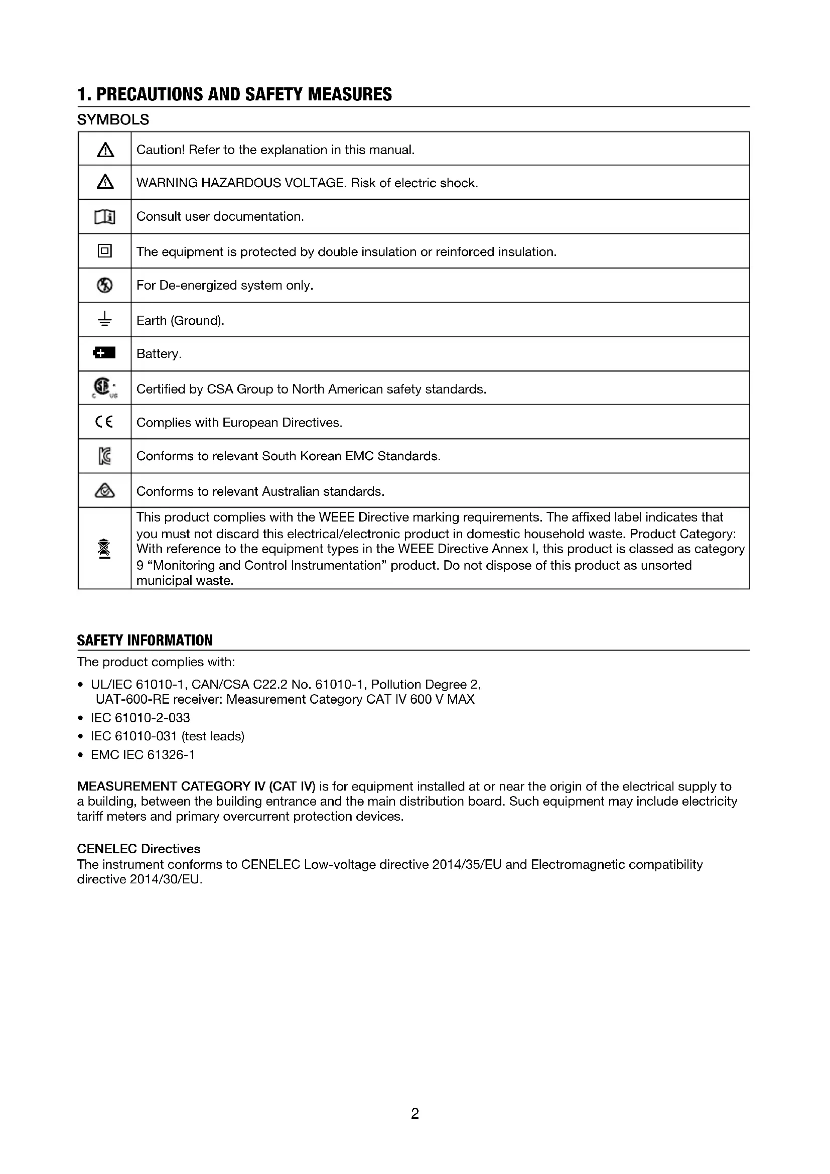 - EMC IEC 61326-1 MEASUREMENT CATEGORY lV (CAT IV) is for equipment installed at or near the origin of the electrical supply to a building, between the building entrance and the main distribution board. Such equipment may include electricity tariff meters and primary overcurrent protection devices. CENELEC Directives The instrument conforms to CENELEC Low-voltage directive 2014/35/EU and Electromagnetic compatibility directive 2014/30/EU.3 Warnings: Read Before Using To avoid the possibility of electric shock or personal injury: