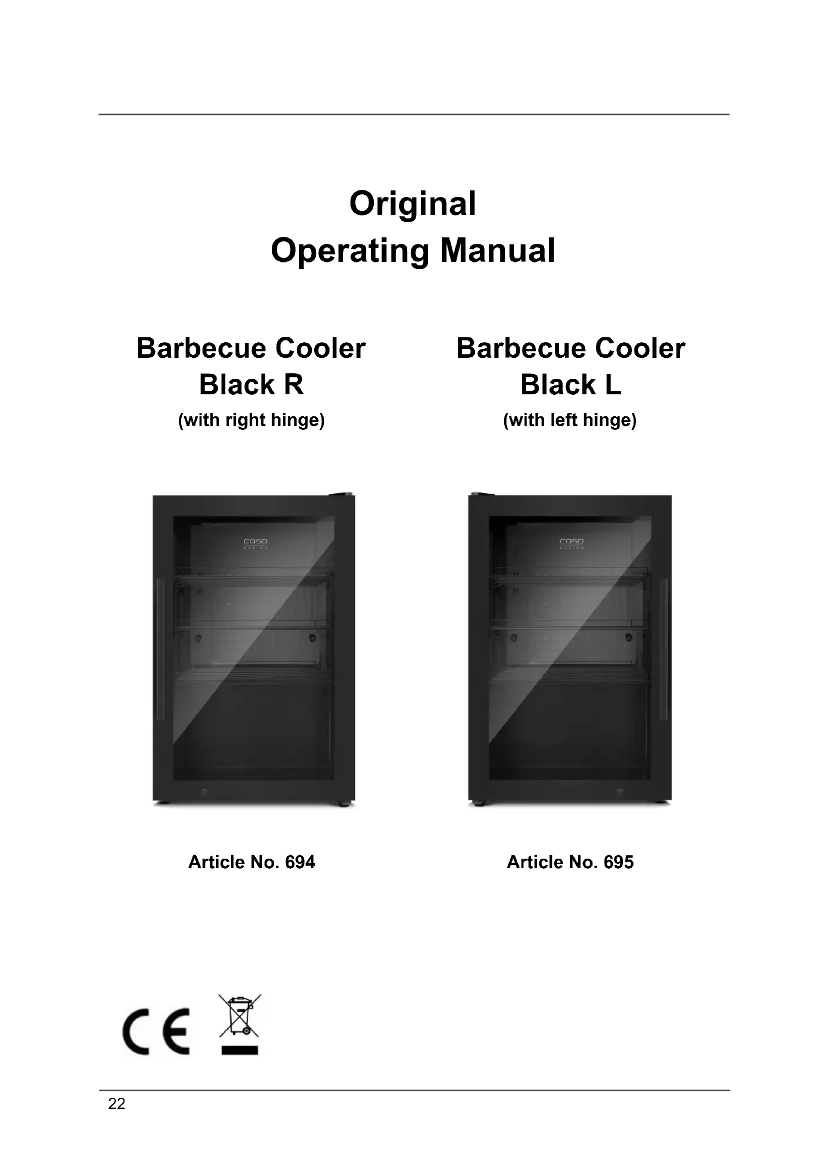 Condensation formed inside the cabinet Under the environment with high level of humidity or the door of wine cabinet has been left open for a long period or opened frequently, wipe off the door and walls. Open the door as rarely as possible. Error code E2 Desired temperature is not reached. If necessary defrost the device (Please follow the hints for manual defrosting in chapter cleaning). Please note ► If you are unable to solve the problem with the steps shown above, please contact Customer Service. 18 Disposal of the Old Device Old electric and electronic devices frequently still contain valuable materials. However, they also contain damaging substances, which were necessary for their functionality and safety. If these were put in the non-recyclable waste or were handled incorrectly, they could be detrimental to human health and the environment. Therefore, do not put your old device into the non-recyclable waste under any circumstances.33 Please note ► Utilise the collection point, established in your town, to return and recycle old electric and electronic devices. If necessary, contact your town hall, local refuse collection service or your dealer for information. ► Ensure that your old device is stored safely away from children until it is taken away: Before you throw away your old refrigerator take off the doors and leave the shelves in place, so that children may not easily climb inside. ► Blowing gas inside the unit is flammable. The disposal of this flammable material should be in accordance with national regulations. 19 Guarantee We provide a 12 month guarantee for this product, commencing from the date of sale, for faults which are attributable to production or material faults. Your legal guarantee entitlements in accordance with § 439 ff. BGB-E remain unaffected by this. The guarantee does not include damages, which were incurred as a result of improper handling or use, as well as malfunctions which only have a minor effect on the function or the value of the device. Consumables, transit damages, inasmuch as we are not responsible for these, as well as damages, which were incurred as a result of any repairs that were not performed by us, are also excluded from the guarantee entitlements. This device is designed for use in commercial situations and has the appropriate performance levels. In the event of justified complaints, we will repair the faulty device at our discretion or replace it with a trouble-free device. Any pending faults must be reported within 14 days of delivery. All further claims are excluded. To enforce a guarantee claim, please contact us prior to returning the device (always provide us with proof of purchase). 20 Technical Data Name Barbecue Cooler Black R (with right hinge) Article No. 694 Barbecue Cooler Black L (with left hinge) Article No. 695 Power 60W Average daily energy consumption 0.350kW.h/24h Daily energy consumption at 16 ° C ambient temperature 0.150kW.h/24h Daily energy consumption at 32 ° C ambient temperature 0.550kW.h/24h Connection 220~240V/50Hz Outside dimensions (W/H/D) 430 x 690 x 570 mm Climate class ST Capacity 63 L Weight 30,7 kg34
