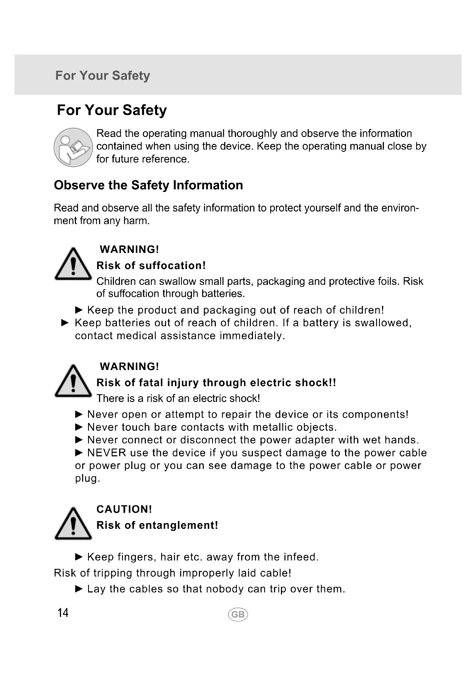 For Your Safety Read the operating manual thoroughly and observe the information contained when using the device. Keep the operating manual close by for future reference. Observe the Safety Information Read and observe all the safety information to protect yourself and the environ- ment from any harm. WARNING! Risk of suffocation! Children can swallow small parts, packaging and protective foils. Risk of suocation through batteries. ► Keep the product and packaging out of reach of children! ► Keep batteries out of reach of children. If a battery is swallowed, contact medical assistance immediately. WARNING! Risk of fatal injury through electric shock!! There is a risk of an electric shock! ► Never open or attempt to repair the device or its components! ► Never touch bare contacts with metallic objects. ► Never connect or disconnect the power adapter with wet hands. ► NEVER use the device if you suspect damage to the power cable or power plug or you can see damage to the power cable or power plug. CAUTION! Risk of entanglement! ► Keep fingers, hair etc. away from the infeed. Risk of tripping through improperly laid cable! ► Lay the cables so that nobody can trip over them.For Your Safety