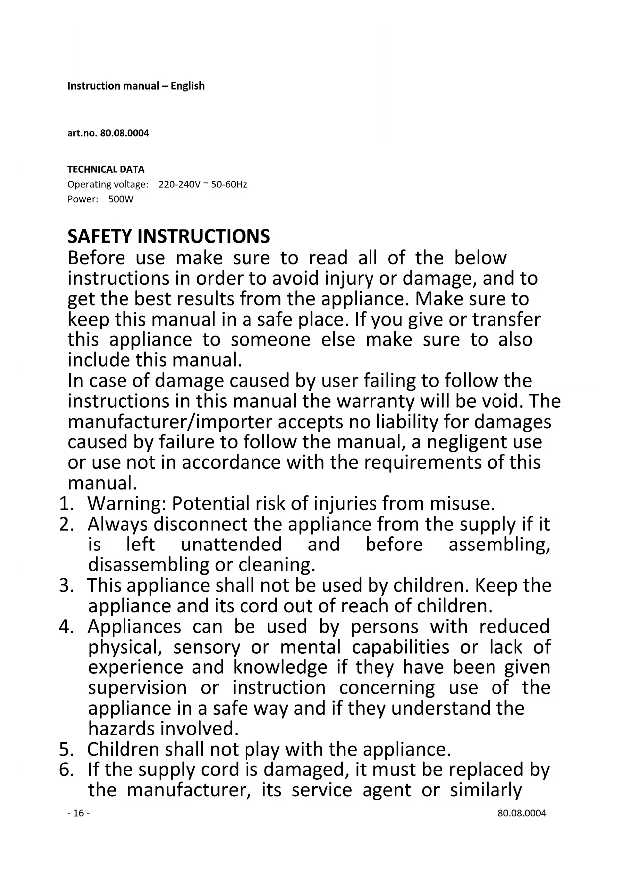 novembre 2019 Hema B.V. Boîte postale 37110 1030 AC Amsterdam Pays-Bas Ces conditions de garantie sont valables sans préjudice des droits légaux du client ou des actions intentées par lui.- 16 - 80.08.0004 Instruction manual – English art.no. 80.08.0004 TECHNICAL DATA Operating voltage: 220-240V ~ 50-60Hz Power: 500W SAFETY INSTRUCTIONS Before use make sure to read all of the below instructions in order to avoid injury or damage, and to get the best results from the appliance. Make sure to keep this manual in a safe place. If you give or transfer this appliance to someone else make sure to also include this manual. In case of damage caused by user failing to follow the instructions in this manual the warranty will be void. The manufacturer/importer accepts no liability for damages caused by failure to follow the manual, a negligent use or use not in accordance with the requirements of this manual.