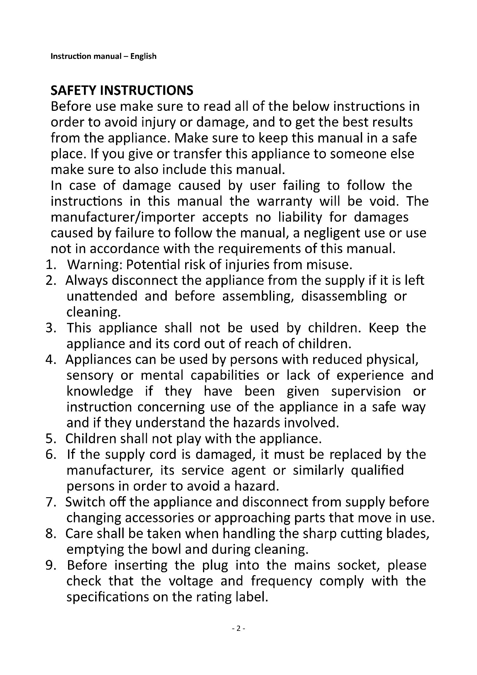 Content – Inhalt – Contenu – Contenuto Instruction manual – English ...................................................................... - 2 - Bedienungsanleitung – Deutsch ................................................................ - 6 - Mode d‘emploi – Français........................................................................ - 11 - Manuale d'istruzioni – Italiano ................................................................ - 16 -- 2 - Instruction manual – English SAFETY INSTRUCTIONS Before use make sure to read all of the below instructions in order to avoid injury or damage, and to get the best results from the appliance. Make sure to keep this manual in a safe place. If you give or transfer this appliance to someone else make sure to also include this manual. In case of damage caused by user failing to follow the instructions in this manual the warranty will be void. The manufacturer/importer accepts no liability for damages caused by failure to follow the manual, a negligent use or use not in accordance with the requirements of this manual.