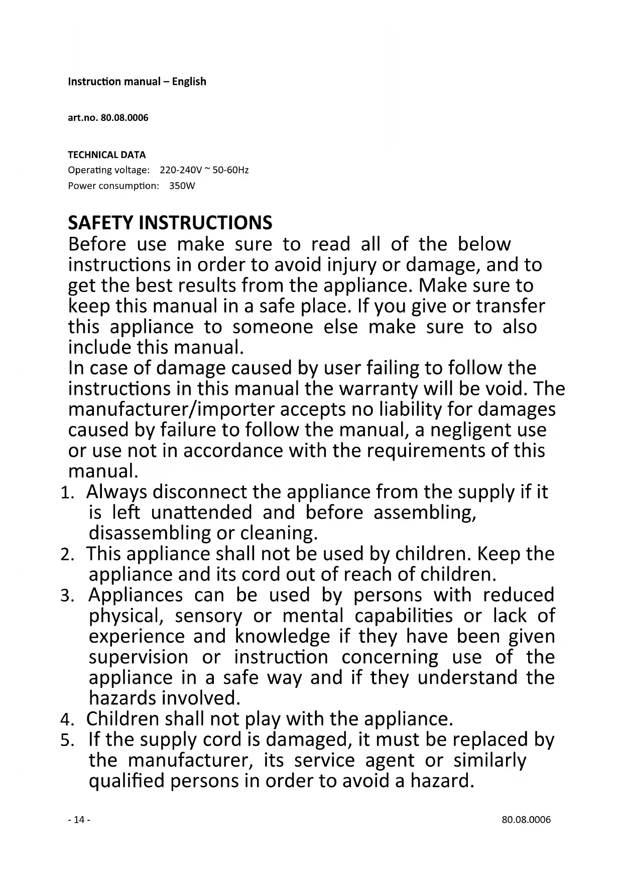 novembre 2019 Hema B.V. Boîte postale 37110 1030 AC Amsterdam Pays-Bas Ces conditions de garantie sont valables sans préjudice des droits légaux du client ou des actions intentées par lui.- 14 - 80.08.0006 Instruction manual – English art.no. 80.08.0006 TECHNICAL DATA Operating voltage: 220-240V ~ 50-60Hz Power consumption: 350W SAFETY INSTRUCTIONS Before use make sure to read all of the below instructions in order to avoid injury or damage, and to get the best results from the appliance. Make sure to keep this manual in a safe place. If you give or transfer this appliance to someone else make sure to also include this manual. In case of damage caused by user failing to follow the instructions in this manual the warranty will be void. The manufacturer/importer accepts no liability for damages caused by failure to follow the manual, a negligent use or use not in accordance with the requirements of this manual.