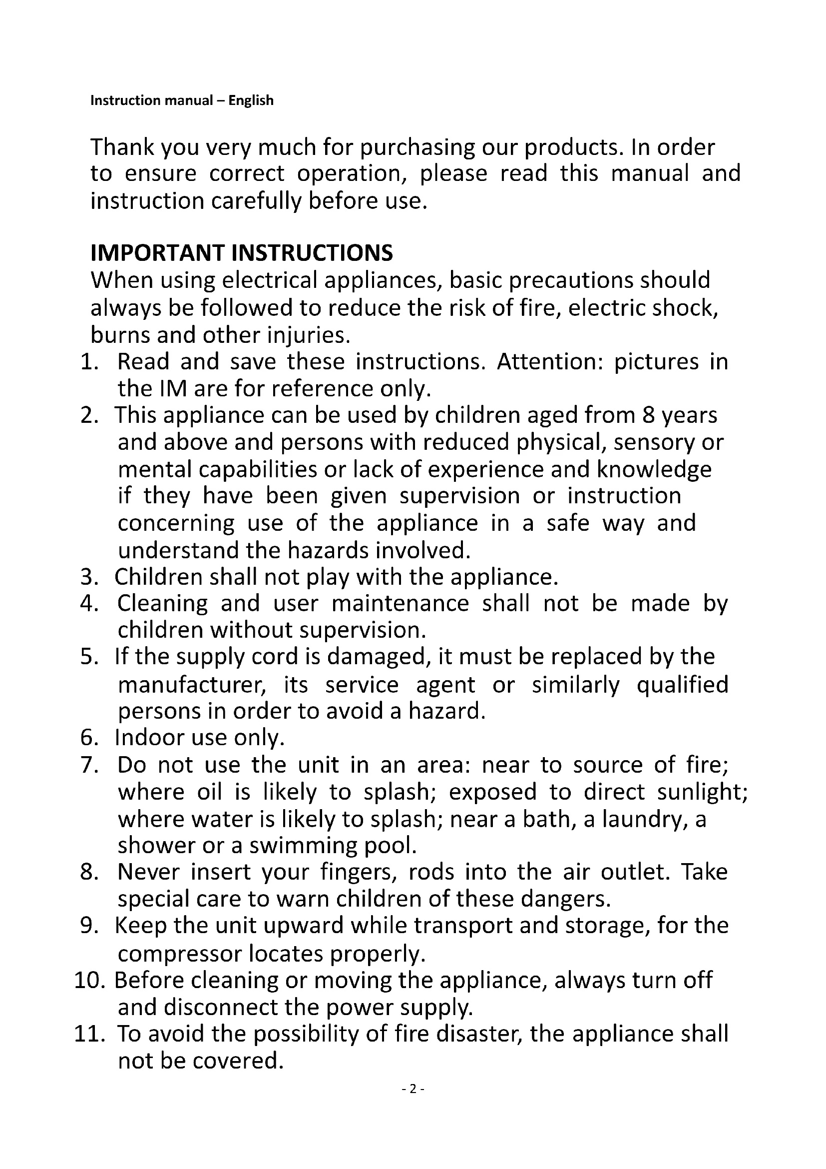 11. To avoid the possibility of fire disaster, the appliance shall
