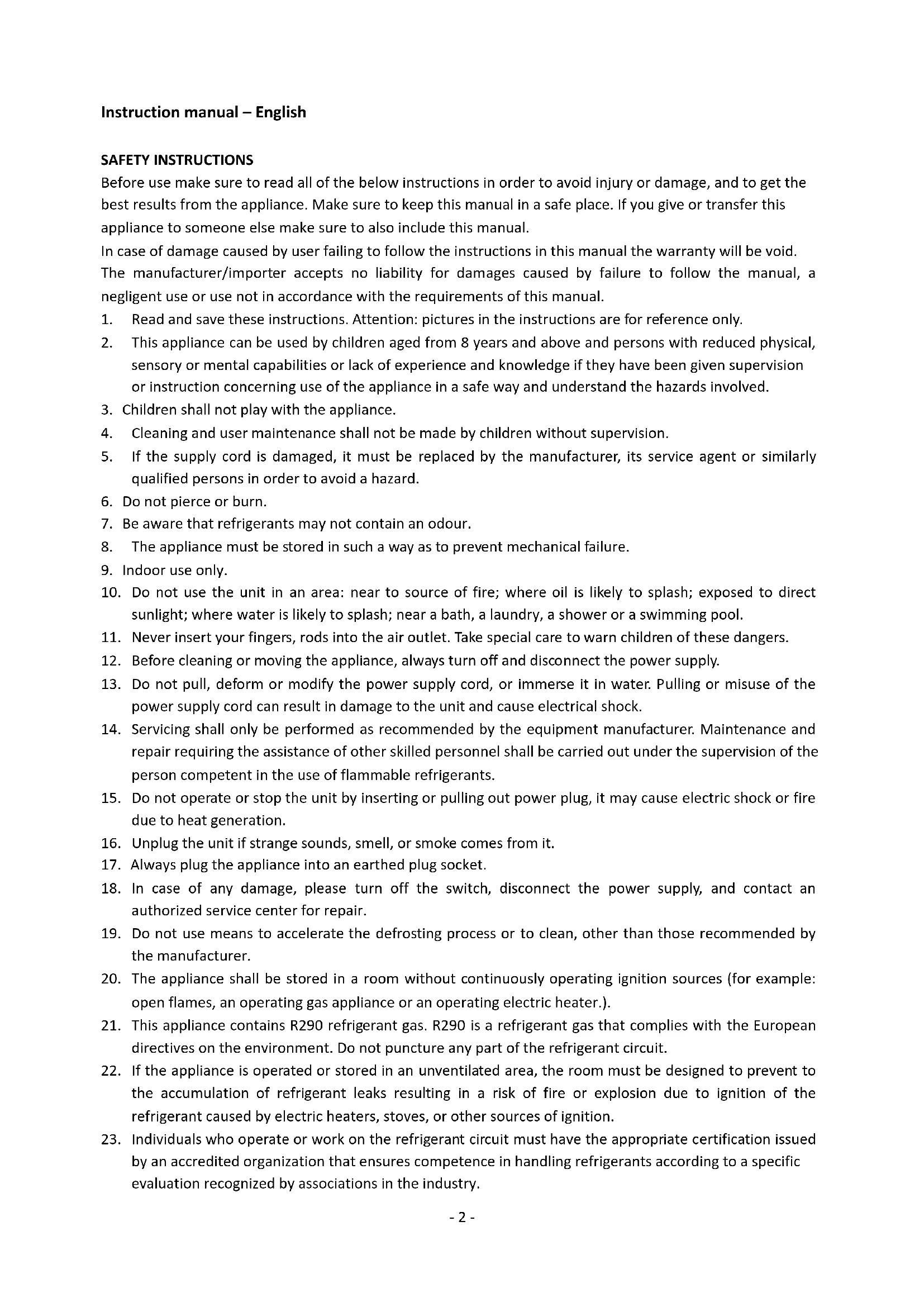 21. This appliance contains R290 refrigerant gas. R290 is a refrigerant gas that complies with the European