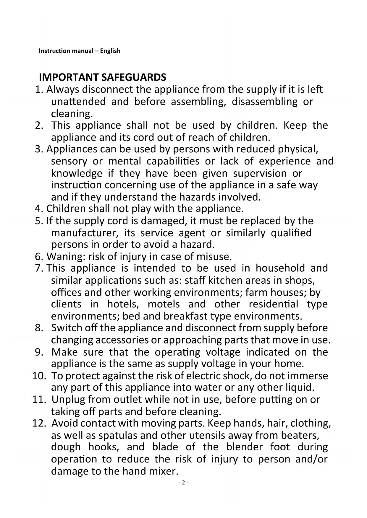 as well as spatulas and other utensils away from beaters, dough hooks, and blade of the blender foot during operation to reduce the risk of injury to person and/or damage to the hand mixer.- 3 -