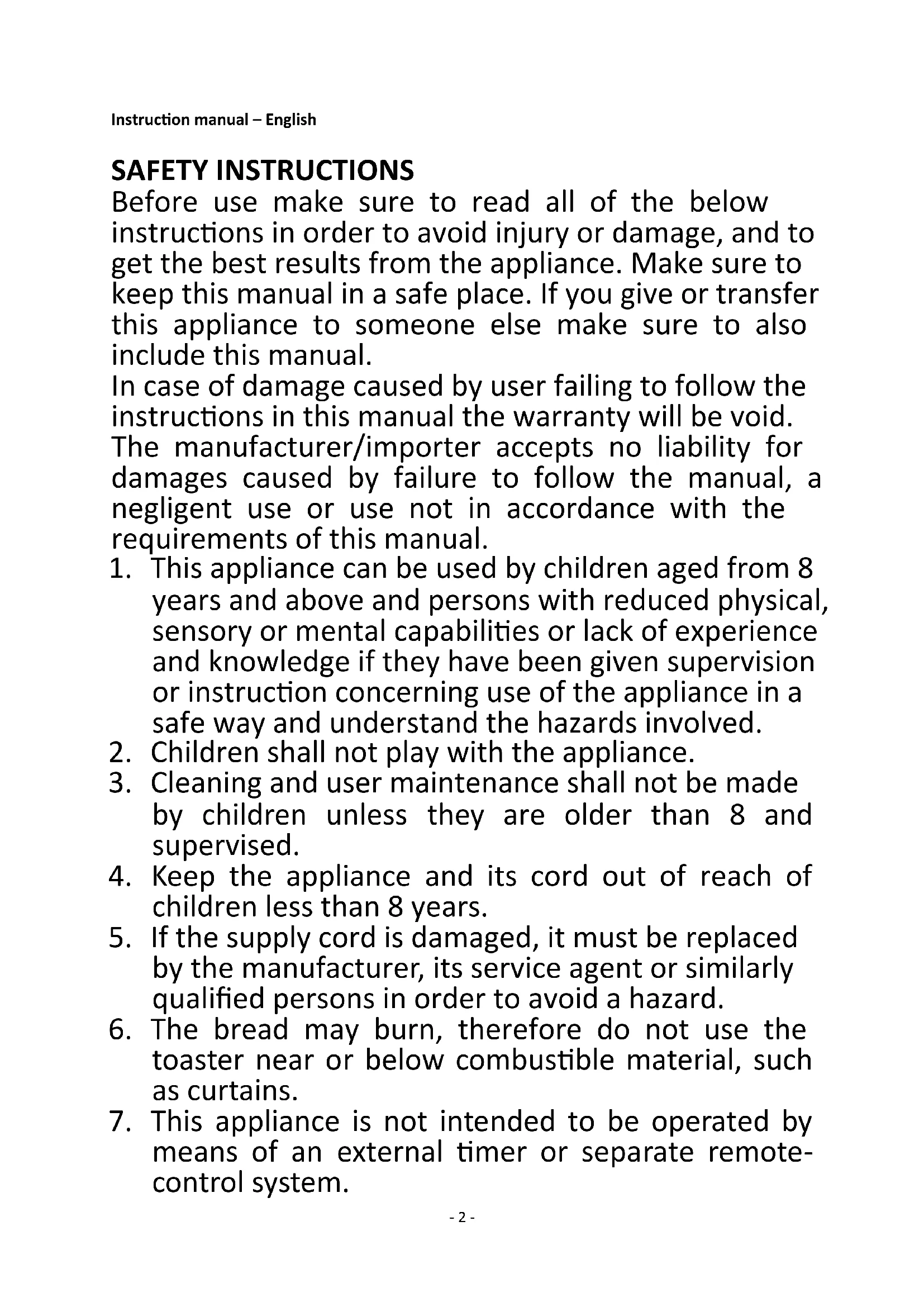 fall out. Clean the crumb tray regularly to avoid crumbs accumulating inside. TECHNICAL DATA Operating voltage: 220-240V ~ 50-60Hz Power: 700W- 6 -