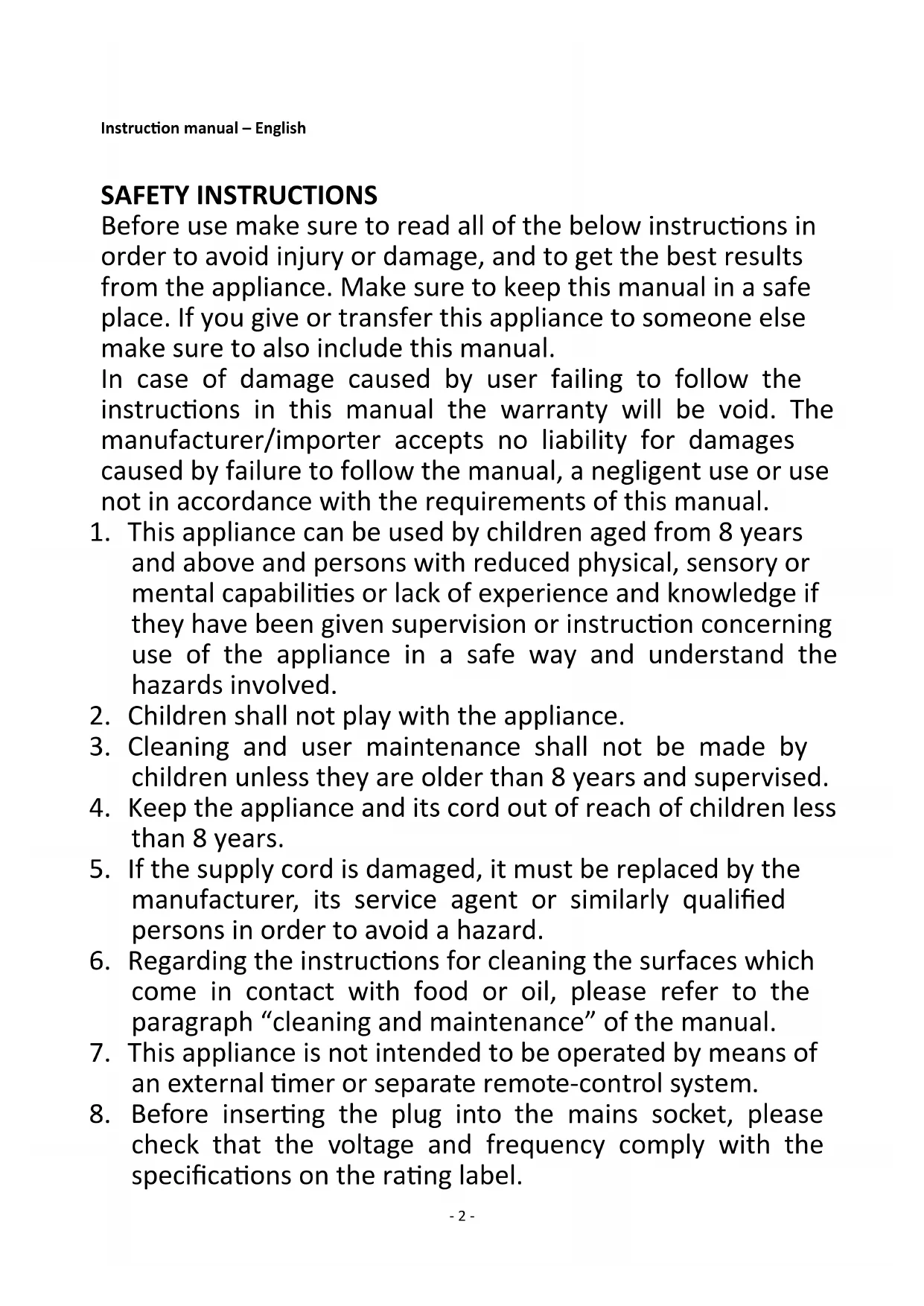 come in contact with food or oil, please refer to the paragraph “cleaning and maintenance” of the manual.