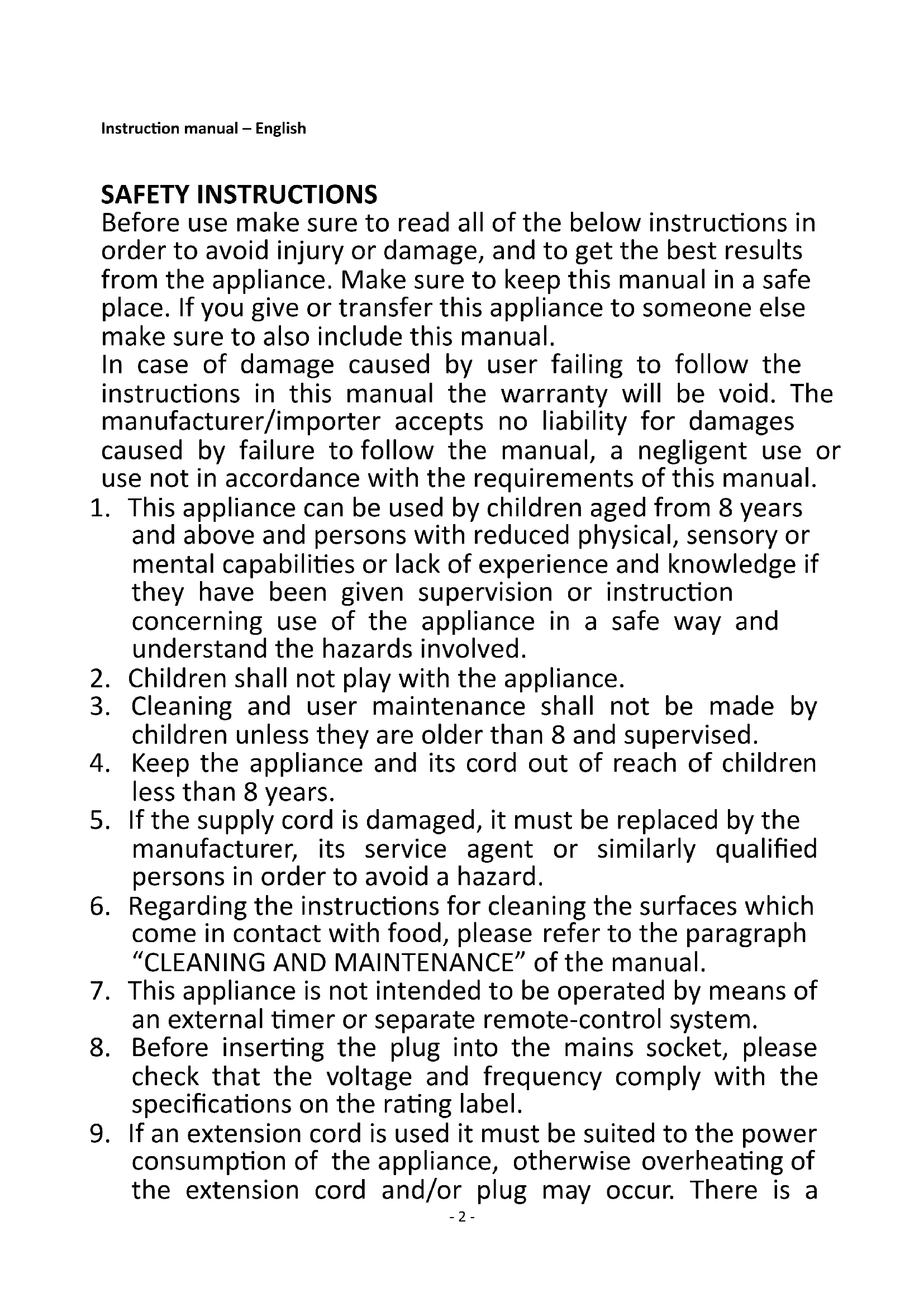 consumption of the appliance, otherwise overheating of the extension cord and/or plug may occur. There is a- 3 - potential risk of injuries from tripping over the extension cord. Be careful to avoid dangerous situations.