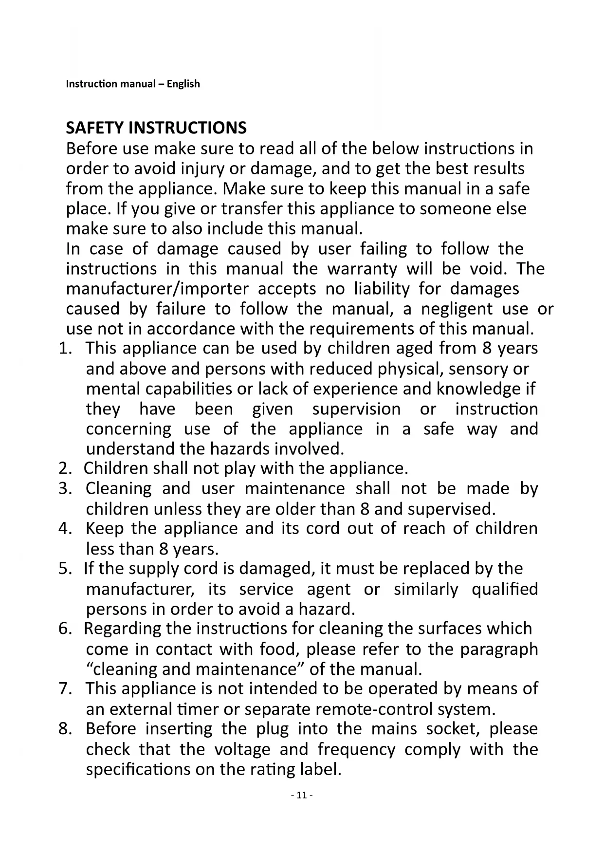 Before delivery our devices are subjected to rigorous quality control. If, despite all care, damage has occurred during production or transportation, please return the device to your dealer. In addition to statutory legal rights, the purchaser has an option to claim under the terms of the following guarantee: For the purchased device we provide 2 years guarantee, commencing from the day of sale. If you have a defective product, you can directly go back to the point of purchase. Defects which arise due to improper handling of the device and malfunctions due to interventions and repairs by third parties or the fitting of non-original parts are not covered by this guarantee. Always keep your receipt, without the receipt you can’t claim any form of warranty. Damage caused by not following the instruction manual, will lead to a void of warranty, if this results in consequential damages then we will not be liable. Neither can we hold responsible for material damage or personal injury caused by improper use if the instruction manual is not properly executed. Damage to accessories does not mean free replacement of the whole appliance. In such case please contact our service department. Broken glass or breakage of plastic parts is always subject to a charge. Defects to consumables or parts subjected to wearing, as well as cleaning, maintenance or the replacement of said parts are not covered by the warranty and are to be paid.