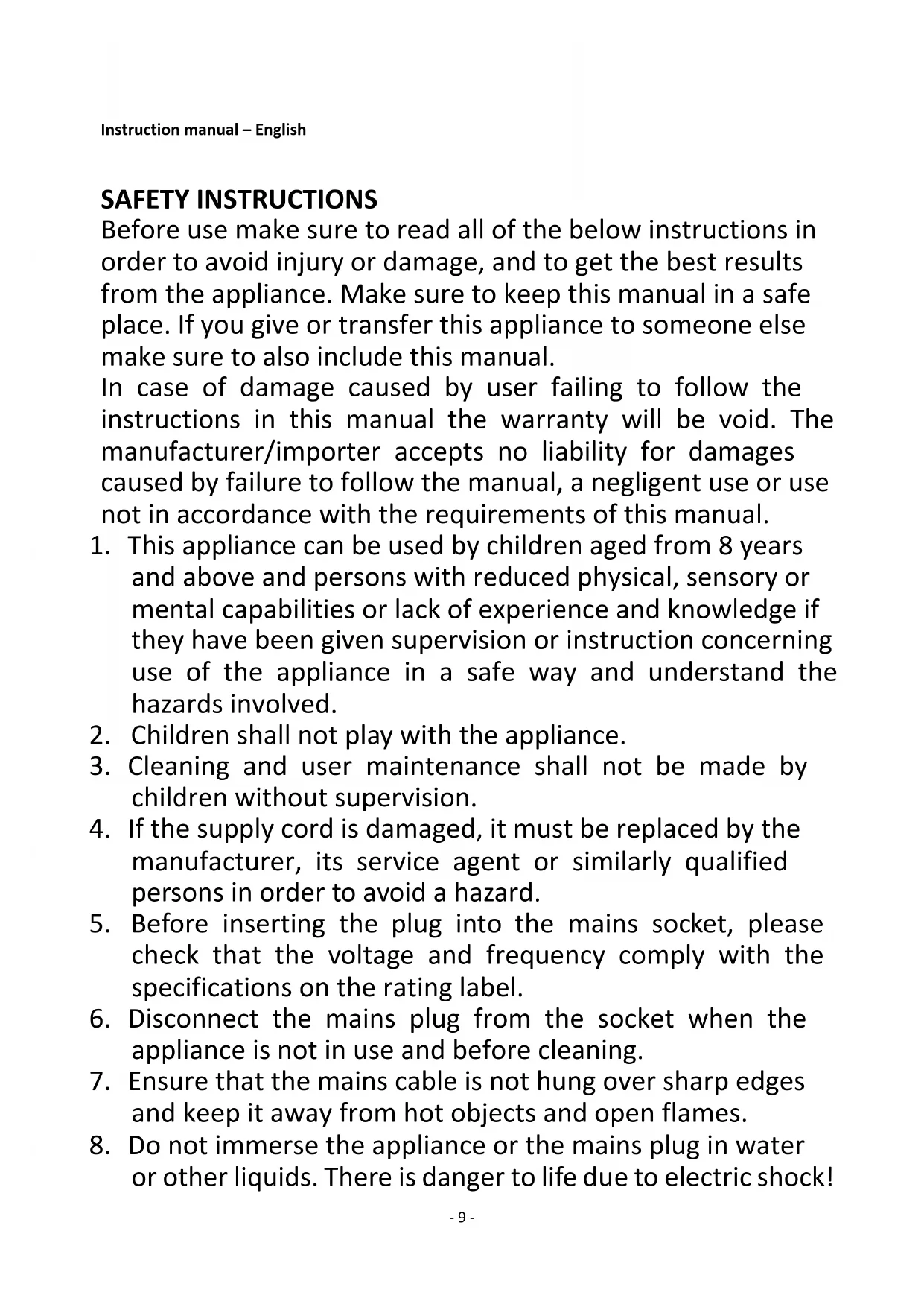 8. Do not immerse the appliance or the mains plug in water