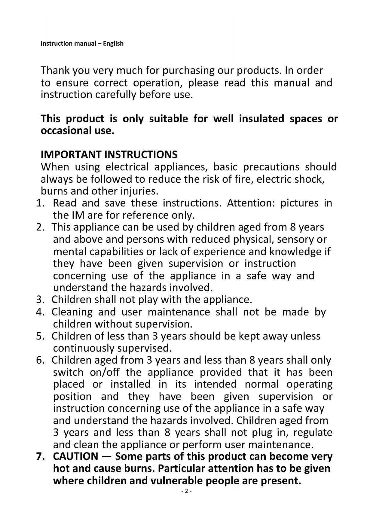 temperature is below the setting, and switch off if it is above the setting. SAFETY SYSTEM ⚫ The appliance has a safety system which automatically switches off the unit when overheated. ⚫ If overheating occurs, switch off the appliance, remove the plug from the socket, and let it cool down for at least 30 minutes. Put the plug in the socket and switch on the heater. ⚫ This heater is equipped with a tilt protection safety device. For safety reasons, the unit will automatically switch off the power if it is put on unstable or uneven surface or if it is tilted accidentally. MAINTENANCE ⚫ The fan heater only needs regular cleaning on the outside. ⚫ Before you clean the unit, turn off the switch. Remove the plug from the socket and wait until the fan heater cools down completely. ⚫ Use a damp cloth to wipe the heater housing. ⚫ Do not use detergents, abrasive cleaning liquids or chemicals (alcohol, gasoline etc.) to clean the appliance. TECHNICAL DATA Operating voltage: 220-240V ~ 50/60Hz Power consumption: 1800-2000W- 7 -