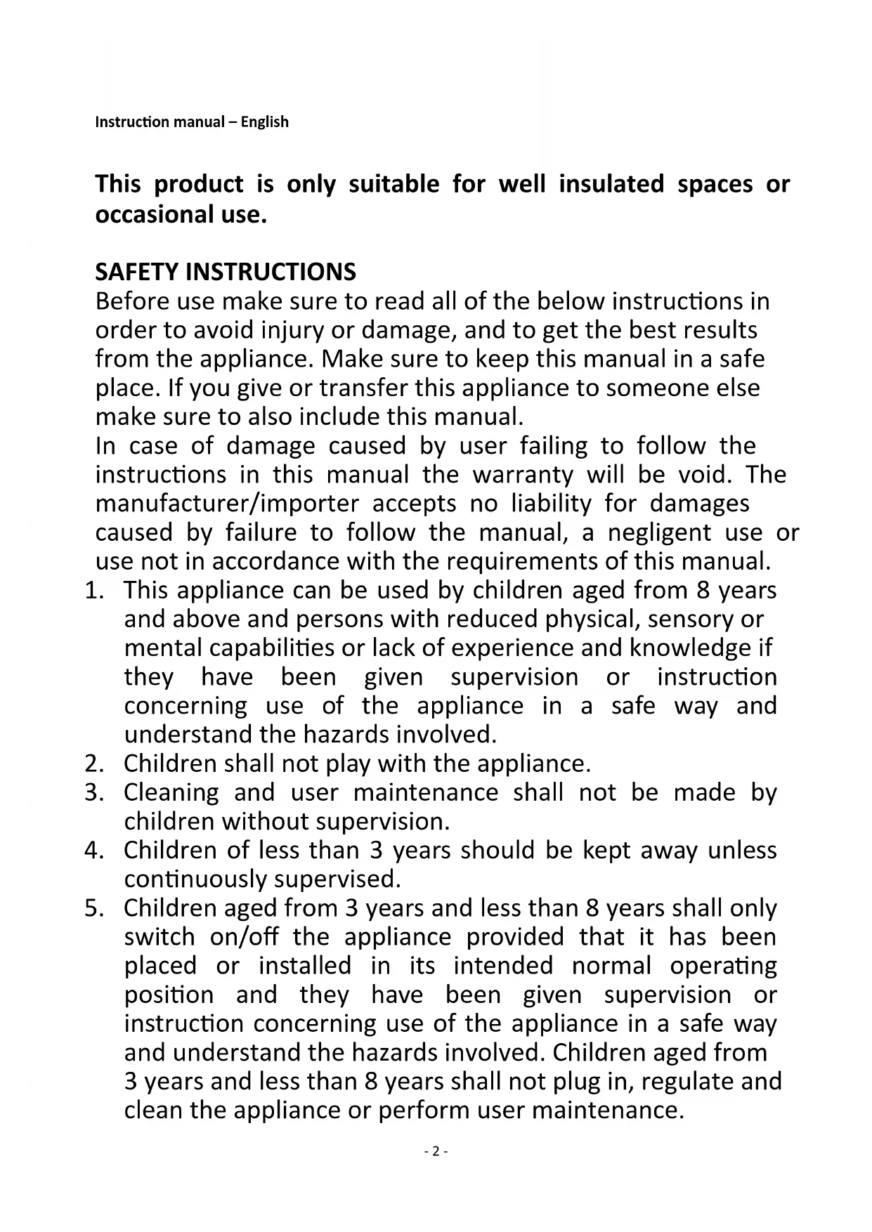Content – Inhalt – Teneur – Contenuto Instruction manual – English ...................................................................................... - 2 - Bedienungsanleitung – Deutsch ............................................................................... - 10 - Mode d’emploi – Français ........................................................................................ - 19 - Manuale d'istruzioni – Italiano ................................................................................. - 27 -- 2 - Instruction manual – English This product is only suitable for well insulated spaces or occasional use. SAFETY INSTRUCTIONS Before use make sure to read all of the below instructions in order to avoid injury or damage, and to get the best results from the appliance. Make sure to keep this manual in a safe place. If you give or transfer this appliance to someone else make sure to also include this manual. In case of damage caused by user failing to follow the instructions in this manual the warranty will be void. The manufacturer/importer accepts no liability for damages caused by failure to follow the manual, a negligent use or use not in accordance with the requirements of this manual.