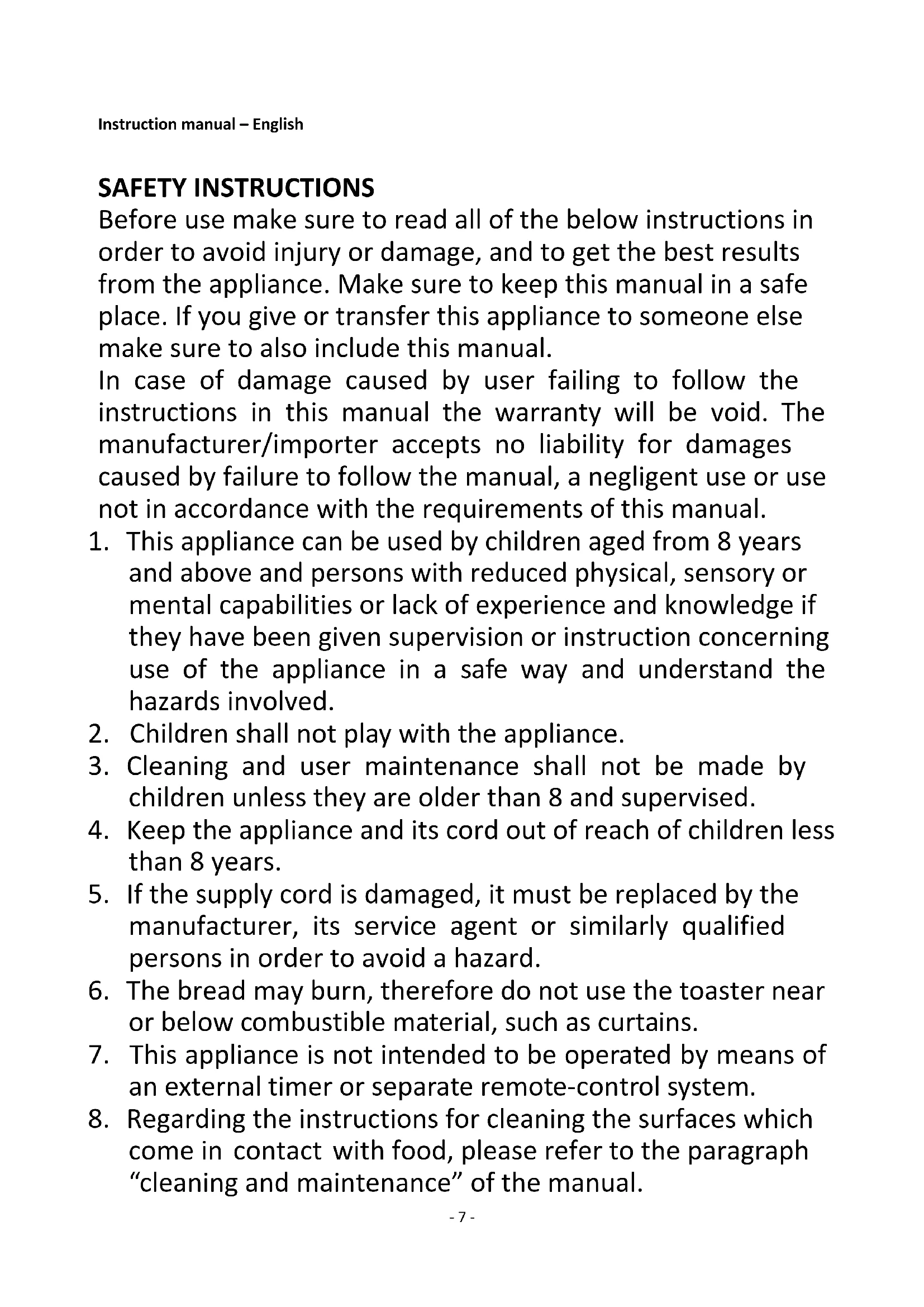 7. This appliance is not intended to be operated by means of