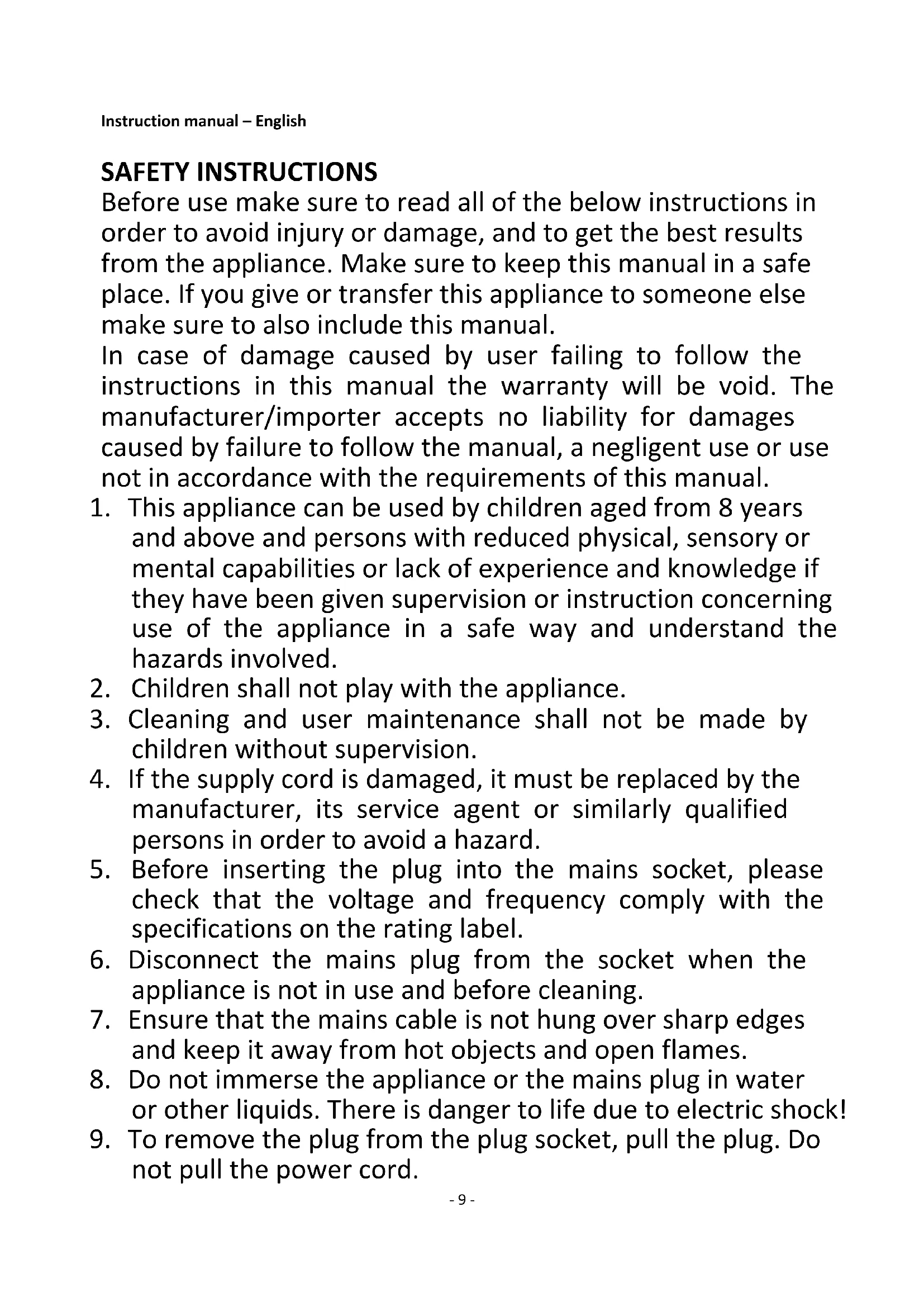 Before delivery our devices are subjected to rigorous quality control. If, despite all care, damage has occurred during production or transportation, please return the device to your dealer. In addition to statutory legal rights, the purchaser has an option to claim under the terms of the following guarantee: For the purchased device we provide 2 years guarantee, commencing from the day of sale. If you have a defective product, you can directly go back to the point of purchase. Defects which arise due to improper handling of the device and malfunctions due to interventions and repairs by third parties or the fitting of non-original parts are not covered by this guarantee. Always keep your receipt, without the receipt you can’t claim any form of warranty. Damage caused by not following the instruction manual, will lead to a void of warranty, if this results in consequential damages then we will not be liable. Neither can we hold responsible for material damage or personal injury caused by improper use if the instruction manual is not properly executed. Damage to accessories does not mean free replacement of the whole appliance. In such case please contact our service department. Broken glass or breakage of plastic parts is always subject to a charge. Defects to consumables or parts subjected to wearing, as well as cleaning, maintenance or the replacement of said parts are not covered by the warranty and are to be paid.
