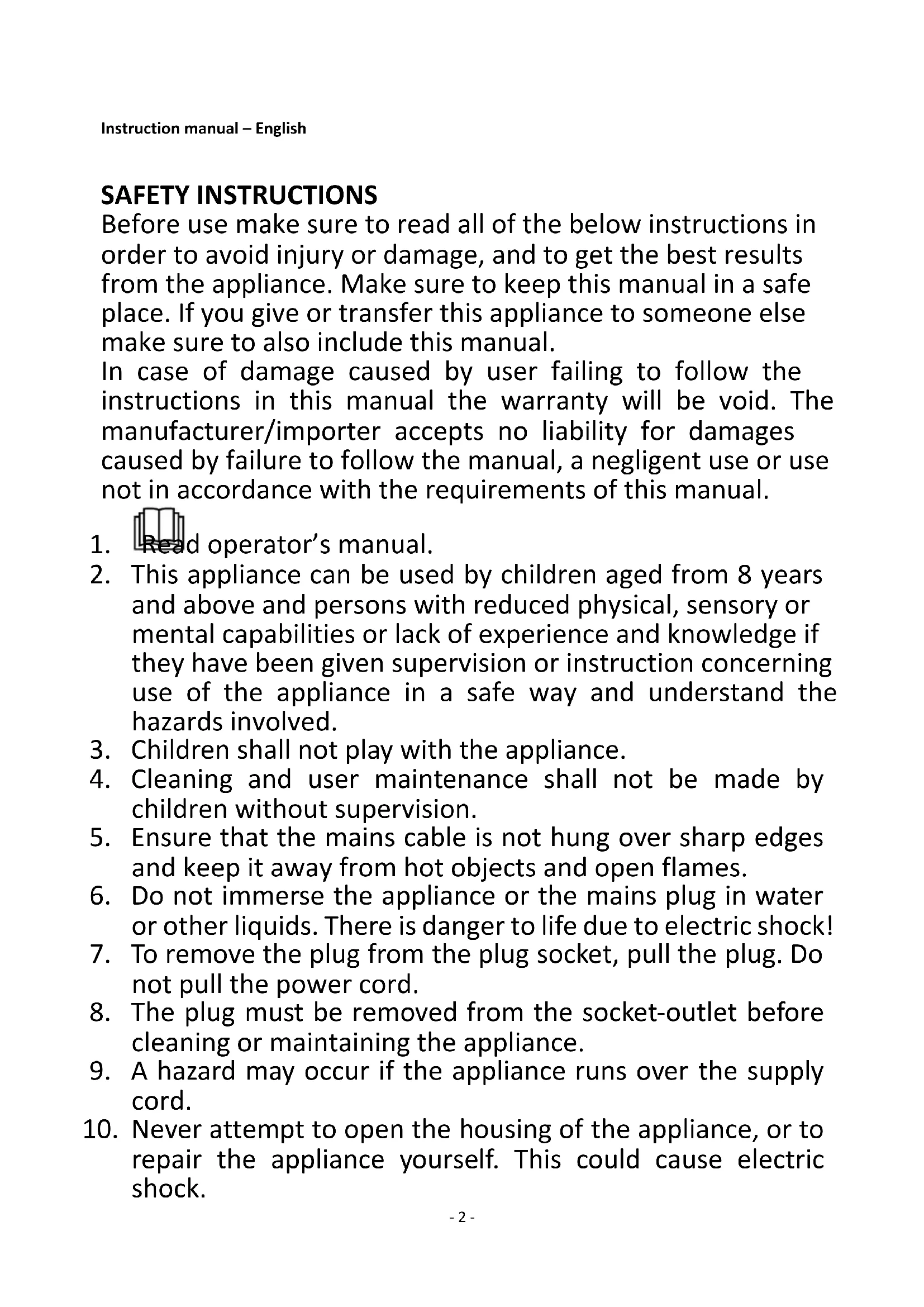 Content – Inhalt – Teneur – Contenuto Instruction manual – English ...................................................................................... - 2 - Bedienungsanleitung – Deutsch ............................................................................... - 10 - Mode d’emploi – Français ........................................................................................ - 19 - Manuale d'istruzioni – Italiano ................................................................................. - 28 -- 2 - Instruction manual – English SAFETY INSTRUCTIONS Before use make sure to read all of the below instructions in order to avoid injury or damage, and to get the best results from the appliance. Make sure to keep this manual in a safe place. If you give or transfer this appliance to someone else make sure to also include this manual. In case of damage caused by user failing to follow the instructions in this manual the warranty will be void. The manufacturer/importer accepts no liability for damages caused by failure to follow the manual, a negligent use or use not in accordance with the requirements of this manual.